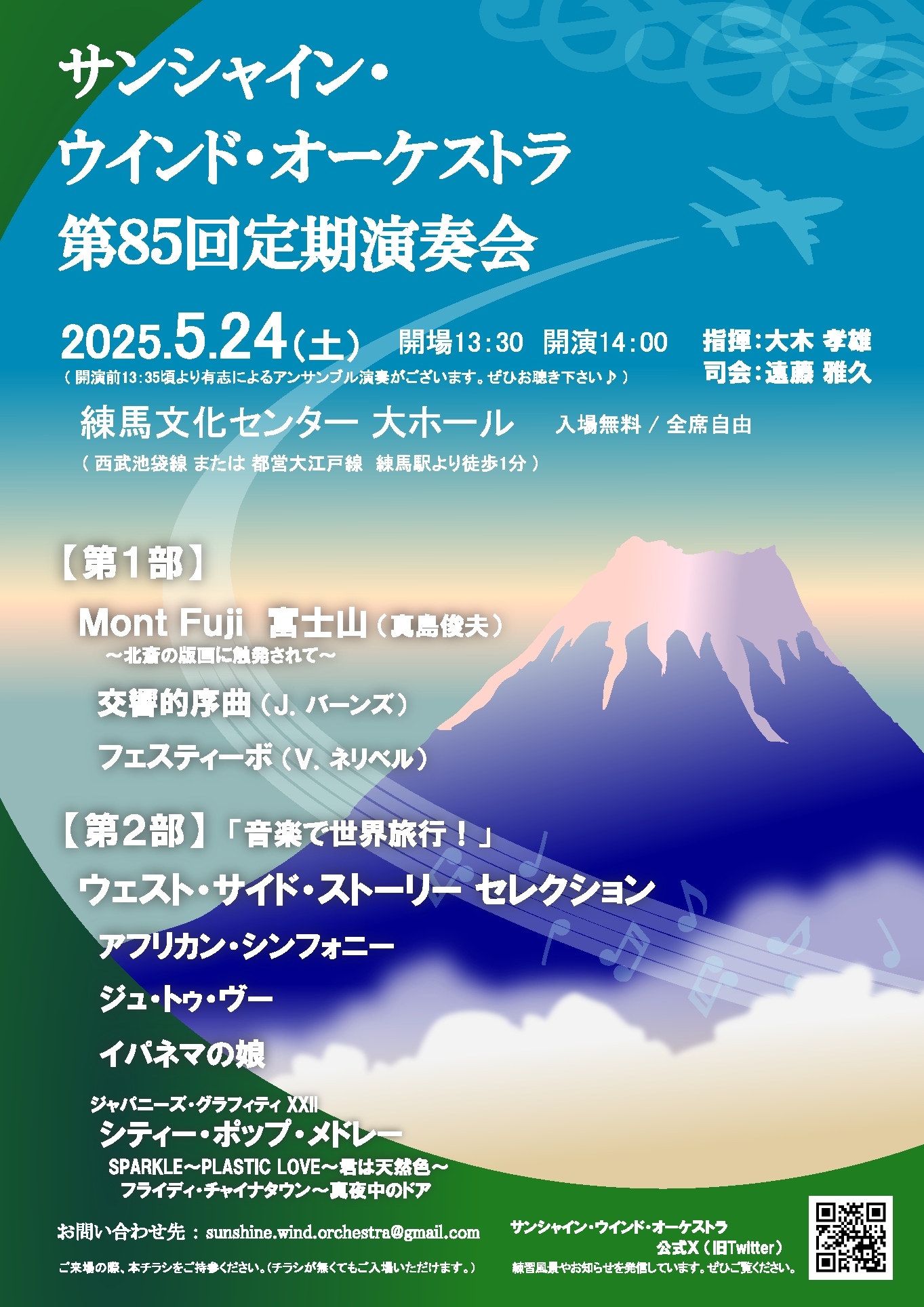 第1部のメイン曲としてコンクールなどでも人気の「Mont Fuji 富士山」をお送りします。葛飾北斎の「富嶽三十六景」に着想を得て富士山の雄大さを描き出した名曲です。めずらしい和楽器も登場しますのでどうぞご注目下さい。その他、オープニングを明るくきらびやかに飾る「交響的序曲」や、荘重で力強いサウンドが特徴的な「フェスティーボ」など全4曲を演奏します。