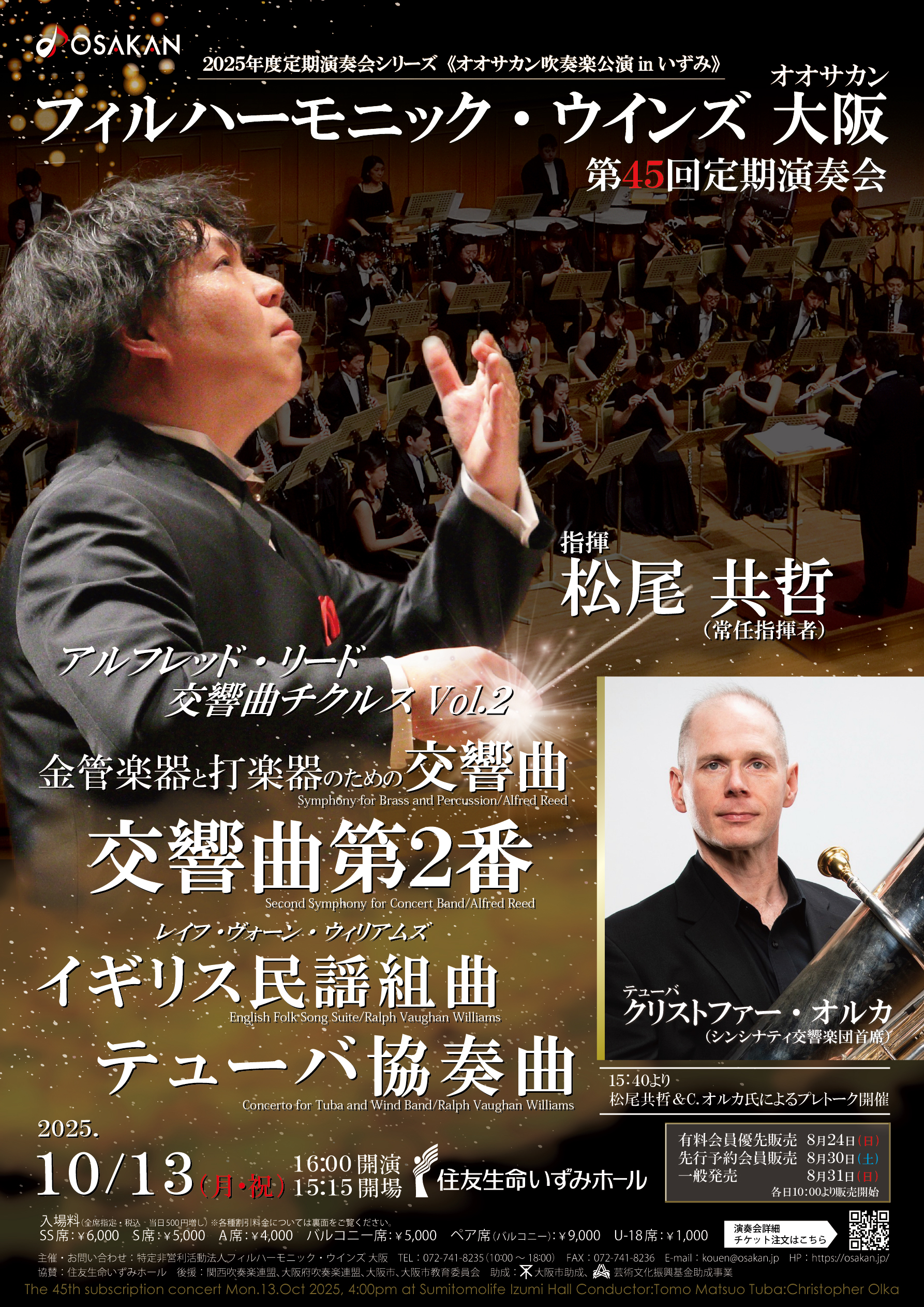 2019年以来2度目の共演となるシンシナティ交響楽団首席テューバ奏者 クリストファー・オルカ氏が登場!早くからYouTubeでのレクチャー動画を配信し、今や世界で大流行しているテューバのレビューをいち早く公開して人気の火付け役になるなど、時代の一歩先を行く氏がテューバ協奏曲の原点ともいえるウィリアムズの傑作を演奏します。オオサカンとのさらなる融合に期待が高まります。また、創立25周年記念《アルフレッド・リード交響曲チクルス》第2弾として、演奏機会の少ない“金管&打楽器のみ”の交響曲、そして緻密な構成と情熱が交錯する『交響曲第2番』を松尾共哲×オオサカンの精緻かつエネルギッシュなサウンドでお届けいたします。圧巻のテューバソロと吹奏楽の多彩な表現をぜひ生でお楽しみください!