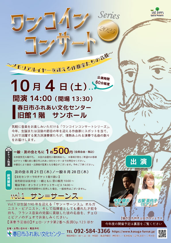 ホールで気軽に音楽をお楽しみいただけるシリーズ企画「ワンコインコンサートシリーズ」。今年度第1弾は、生誕190周年を迎えたサン=サーンスの世界をチェロとピアノのデュオでお届けします。出演はチェリスト宇野健太さんとピアニスト古賀美代子さん。ワンコインで気軽に楽しめる贅沢なひとときをお楽しみください。