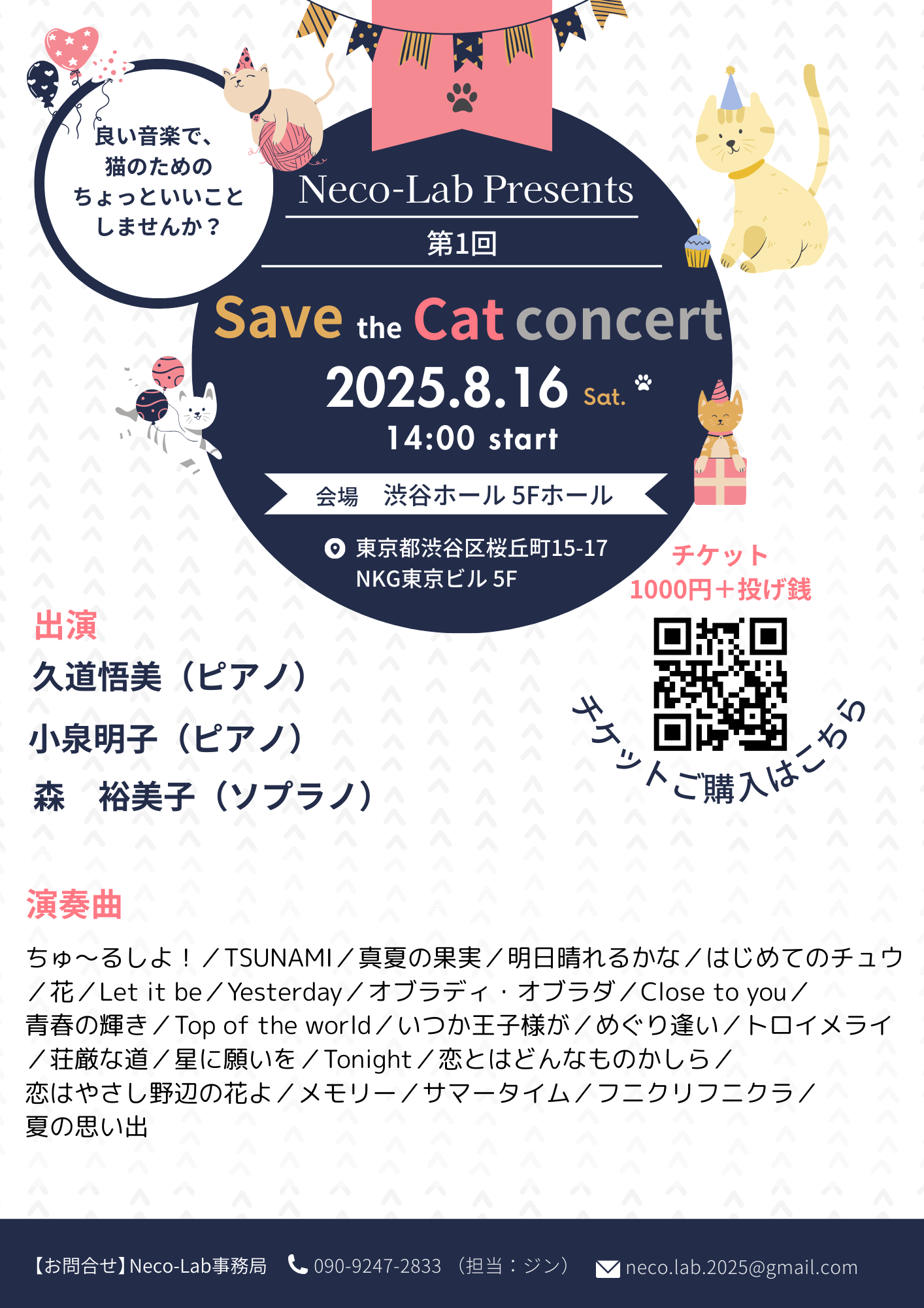 このコンサートは、街で活動している野良猫の保護ボランティアさんに支援をする目的で開催するチャリティーイベントです。