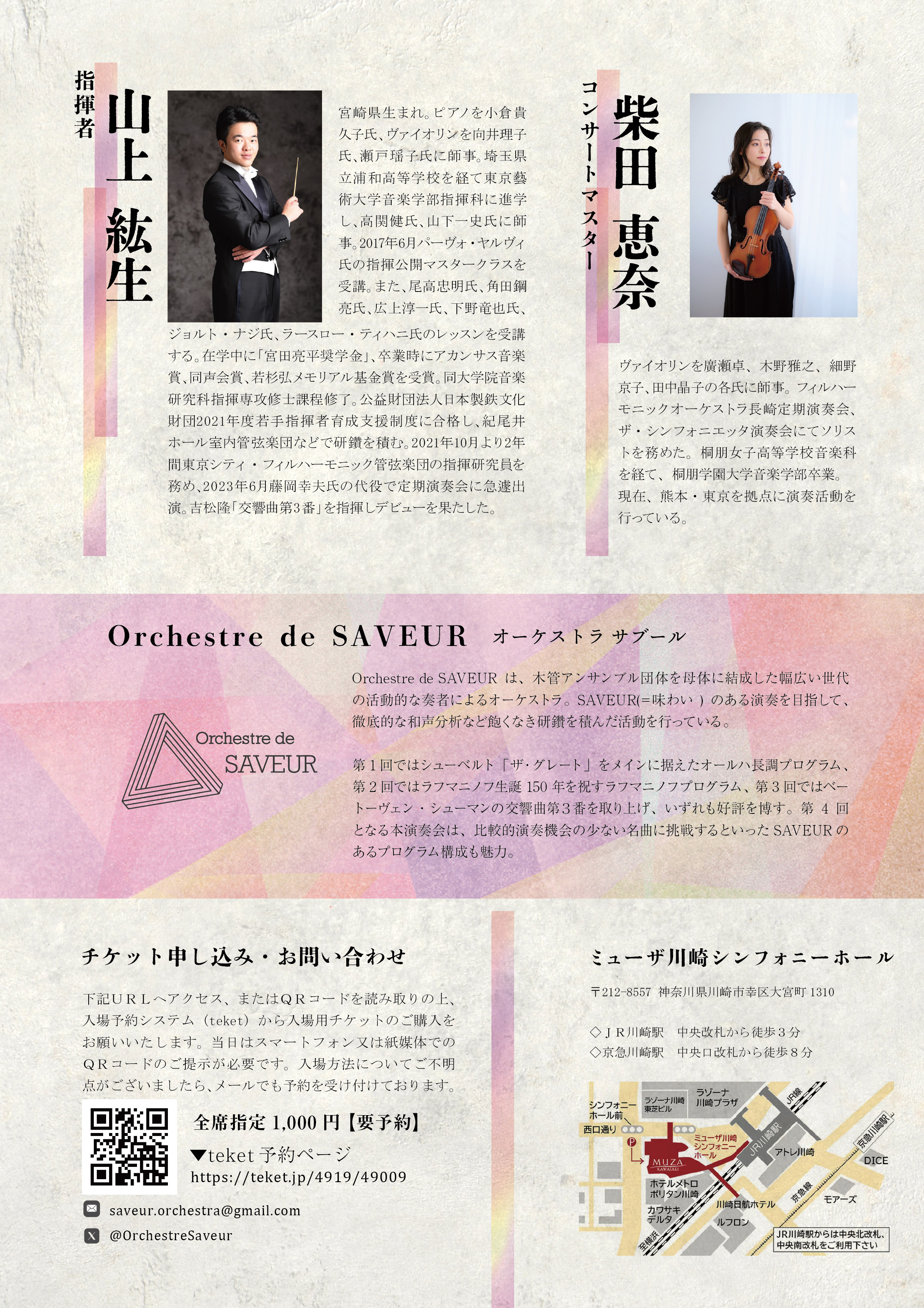 Orchestre de SAVEURは木管アンサンブルを母体に、徹底的な和声分析と味わい深い表現を追求する若手奏者によるオーケストラです。第4回演奏会では、比較的演奏機会の少ない名曲へ挑戦し、ベートーヴェンの交響曲第2番とブルックナーの交響曲第7番(ノヴァーク版)を取り上げます。ミューザ川崎シンフォニーホールの響きをいかし、緻密なアンサンブルと躍動する感性が織りなす魅力的なステージをどうぞお楽しみください。