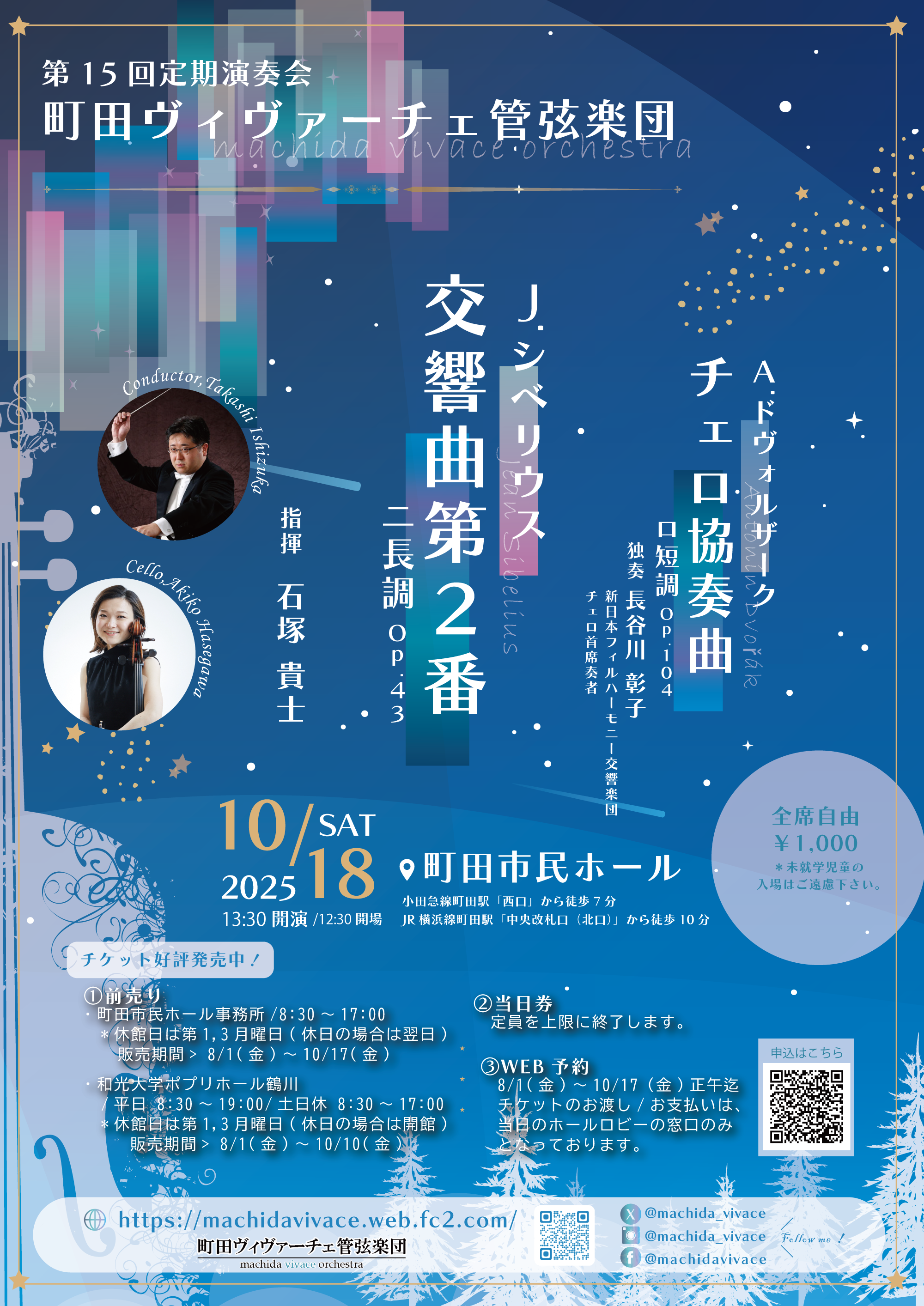 町田ヴィヴァーチェ管弦楽団による第15回定期演奏会では、石塚貴士の精緻なタクトのもと、新日本フィルハーモニー交響楽団 首席奏者・長谷川彰子をチェロ独奏に迎え、ドヴォルザークの深い情感あふれるチェロ協奏曲と、北欧の響きを湛えたシベリウス交響曲第2番をお届けします。