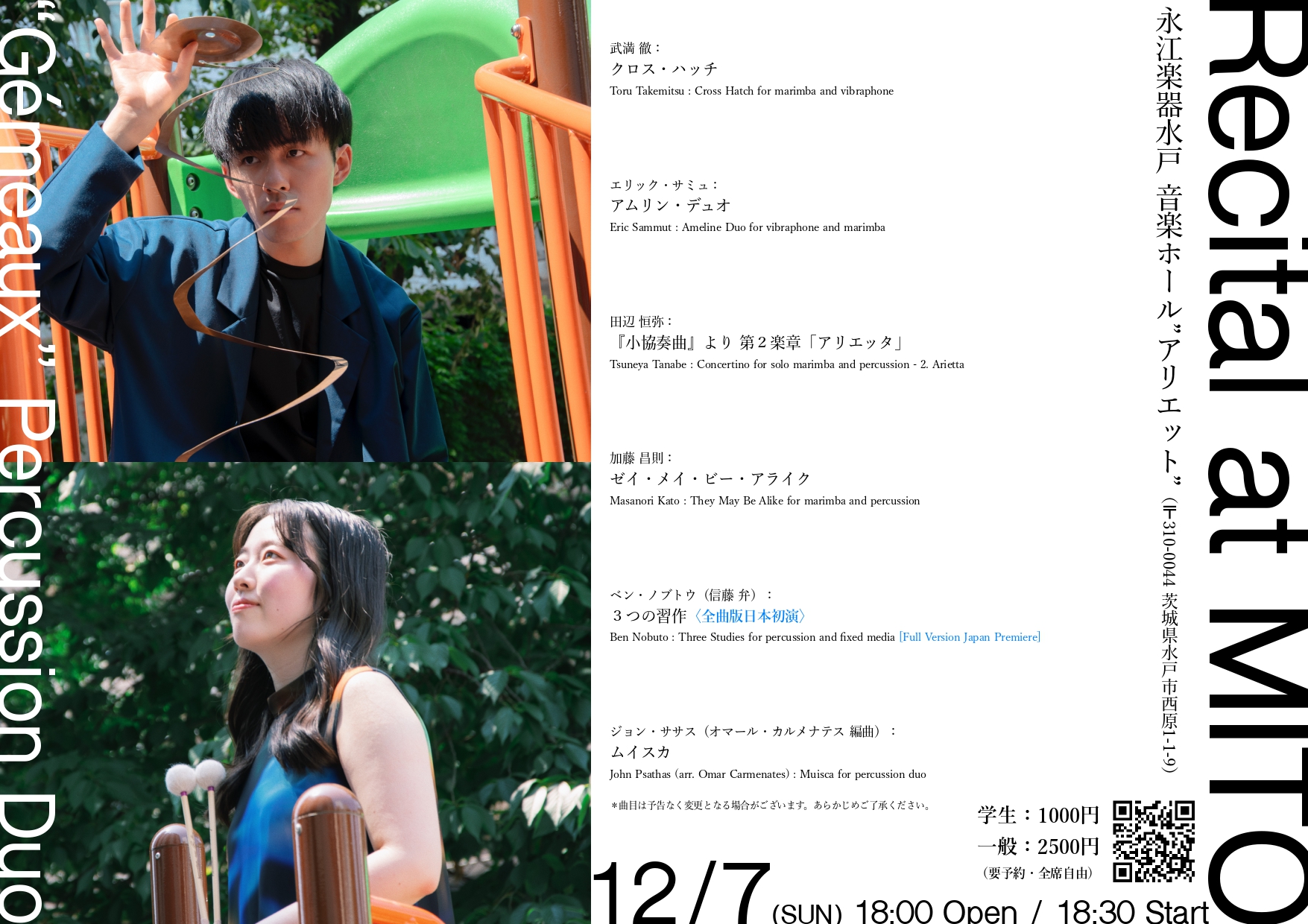 東邦音楽大学で出会った柴沼怜央と針谷杏が結成した、"Gémeaux" Percussion Duo(ジェモー・パーカッション・デュオ)。今回は柴沼の故郷である茨城県・水戸市での初のリサイタル。