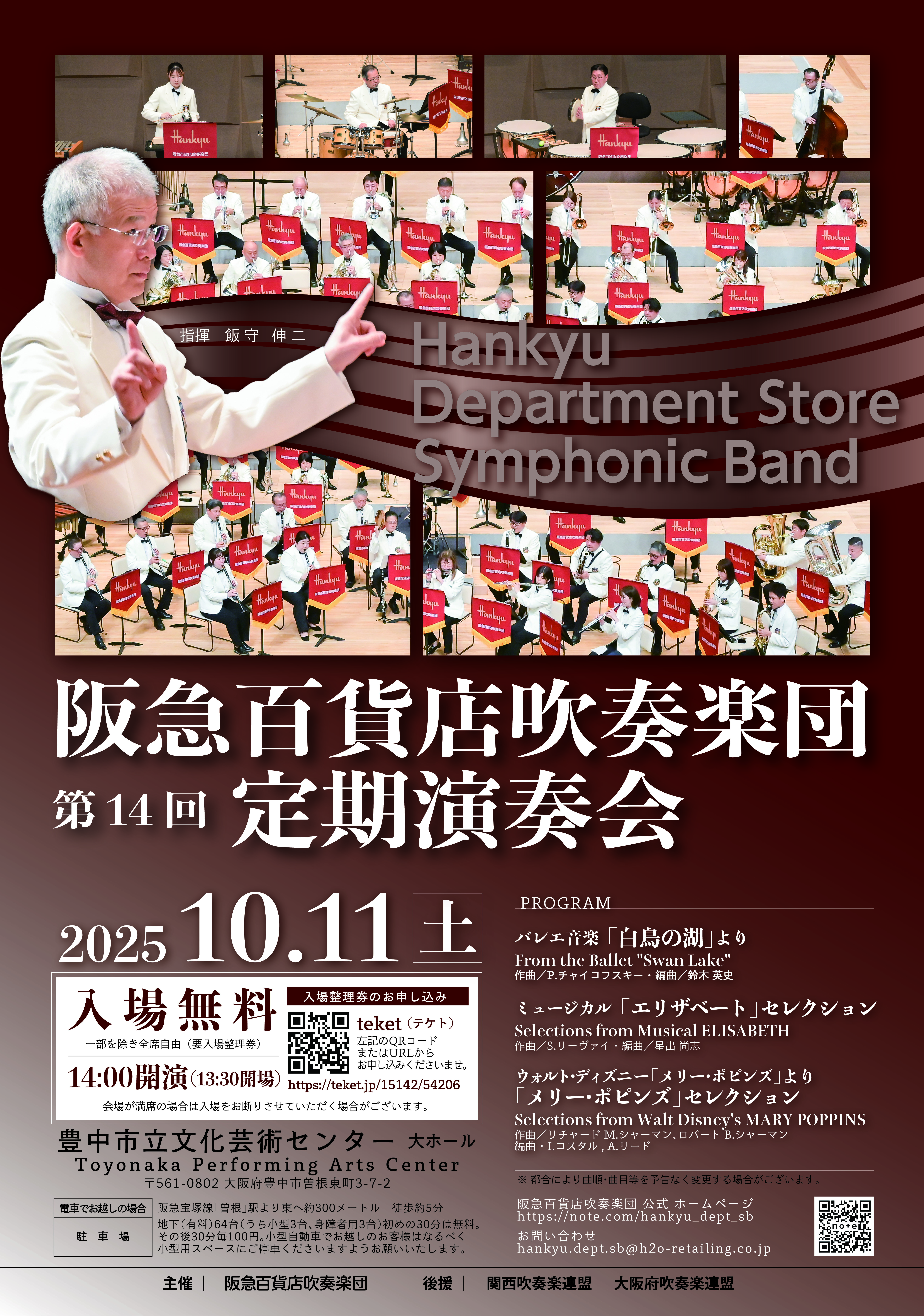 阪急阪神百貨店をはじめとするエイチ・ツー・オー リテイリンググループのメンバーで構成しており、地域の皆様に愛される楽団を目指し活動しています。第14回定期演奏会では、吹奏楽の豊かな響きで贈る珠玉のプログラムをご用意しました。バレエ音楽『白鳥の湖』や、不朽の名作ミュージカル『エリザベート』、そして心躍るディズニー映画『メリー・ポピンズ』のセレクションなどを演奏いたします。皆様お誘い合わせの上、ぜひご来場ください。
