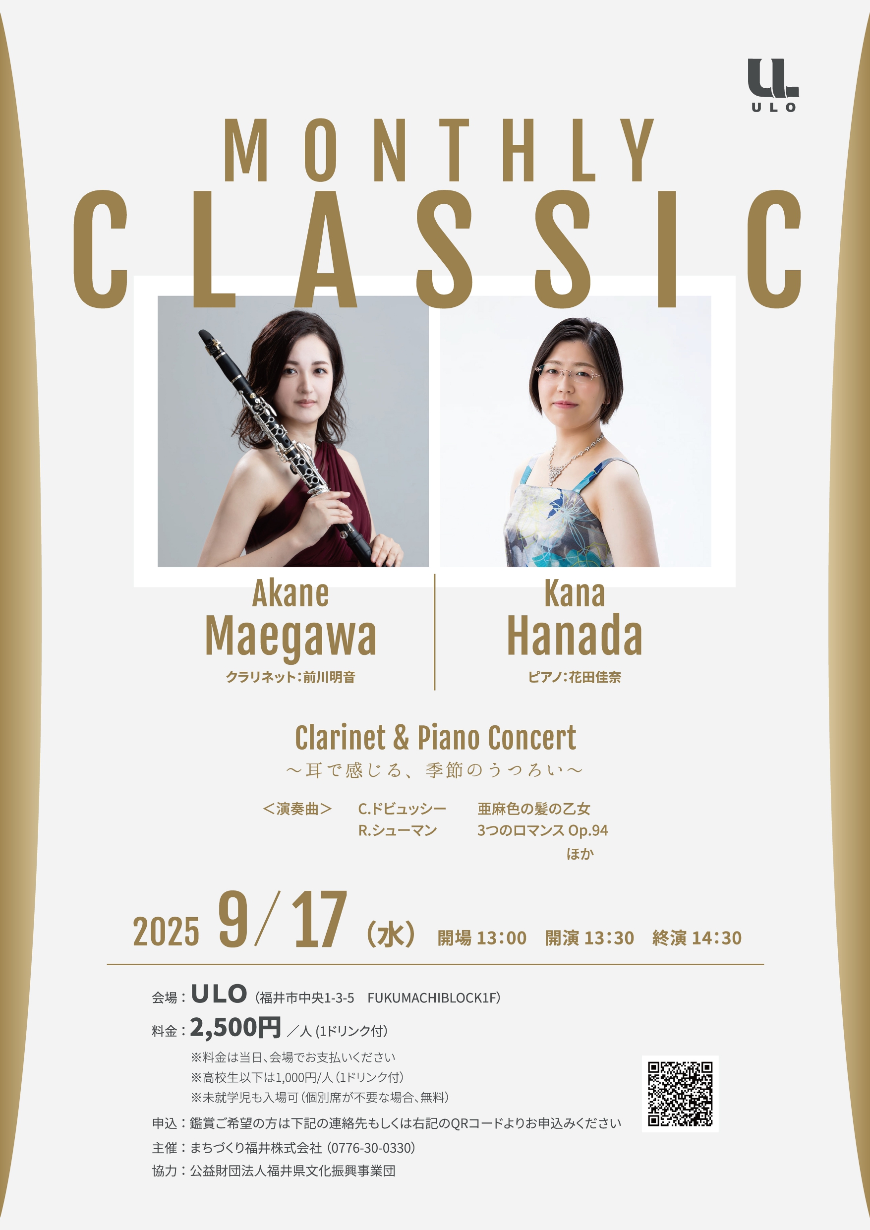 福井市のULOで、クラリネットの前川明音さんとピアノの花田佳奈さんによるデュオ・コンサートが開催されます。ドビュッシー「亜麻色の髪の乙女」、シューマン「3つのロマンス Op.94」をはじめ、繊細な色彩感とロマン派の歌心を味わえるプログラムです。入場料は一般2,500円(1ドリンク付)、高校生以下1,000円(1ドリンク付)、未就学児は個別席不要の場合無料。料金は当日会場支払い。心地よい響きに包まれる上質なひとときをお楽しみください。