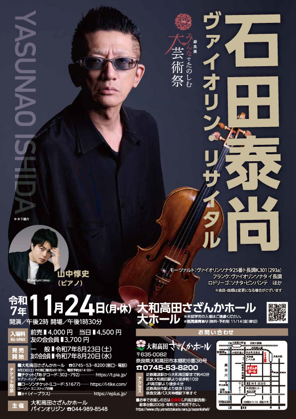 日本を代表するヴァイオリニスト石田泰尚が大和高田さざんかホール大ホールに登場し、ピアニスト山中惇史とともに珠玉のプログラムをお届けします。澄みわたる音色と緻密なアンサンブルが織りなす演奏は、必聴!