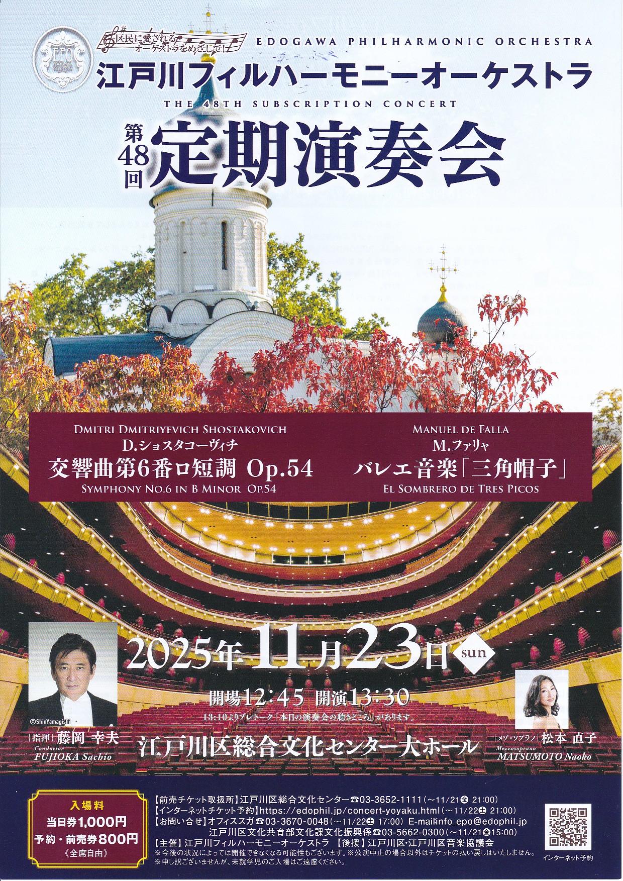 今年の秋定期も世界的に活躍されている藤岡先生が指揮をしてくださることになりました。前半のショスタコーヴィチの交響曲第6番はあまり知られていませんが、藤岡先生が大好きな曲です。第1楽章は悲しみにあふれ、そして息をのむほど美しい曲で、第2.3楽章はそれに反発するようにエネルギーにあふれエキサイティングな曲になっています。後半のファリャのバレエ音楽「三角帽子」は江戸フィル管楽器奏者が長年やりたいと切望していた曲です。舞台はスペイン、三角帽子(権威の象徴)を被った代官が美しい粉屋の女房を誘惑するのですが、ことごとく失敗して散々な目にあいます。その様子を見ていた民衆は大いに盛り上がり、陽気に踊りまくるという話です。団員の「オレ!」という掛け声、藤岡先生の「語り」も入ります。今回はロシアとスペインそれぞれの国の雰囲気が色濃く味わえるプログラムです。パワフルで楽しい演奏会になるようがんばります。皆さんのお越しをお待ちしております。