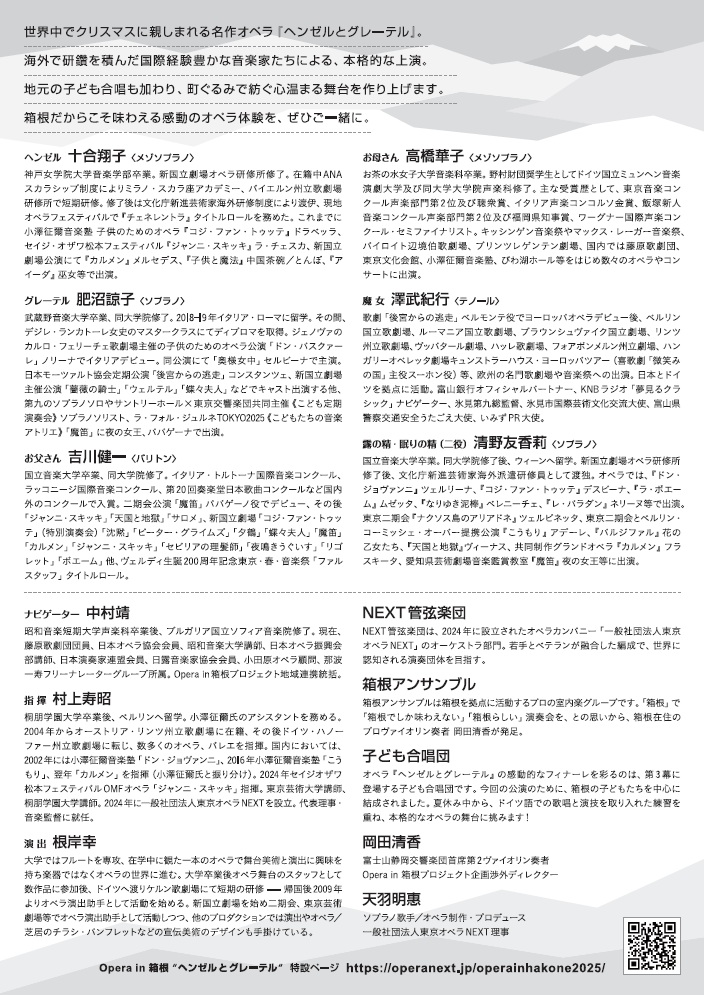 東京オペラNEXTが箱根・仙石原文化センターにて贈る『ヘンゼルとグレーテル』は、フンパーディンクの名作を原語ドイツ語で全幕上演する公演です。村上寿昭の指揮のもと、十合翔子、肥沼諒子ら実力派キャストと、箱根のこども合唱団、そして室内楽団(NEXT管弦楽団/箱根アンサンブル)が織りなす幻想的な舞台を、ドイツ語の原語上演・字幕付きで存分にお楽しみいただけます。家族連れからオペラ愛好家まで広くお迎えする本格的な一夜をお見逃しなく。