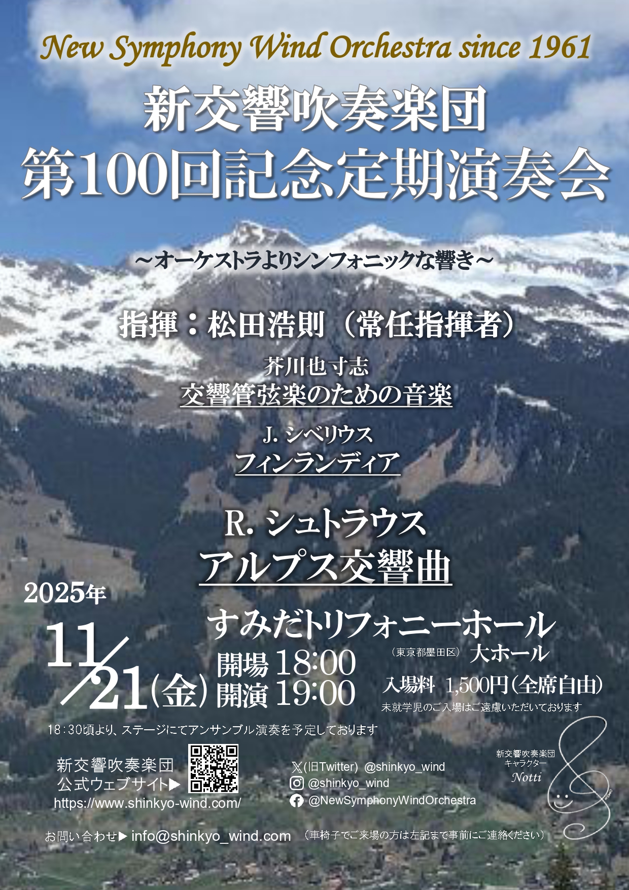 2025年秋は、第100回の定期演奏会を記念しメイン曲としてR.シュトラウスの「アルプス交響曲」に挑戦。団員一同お待ちしております!