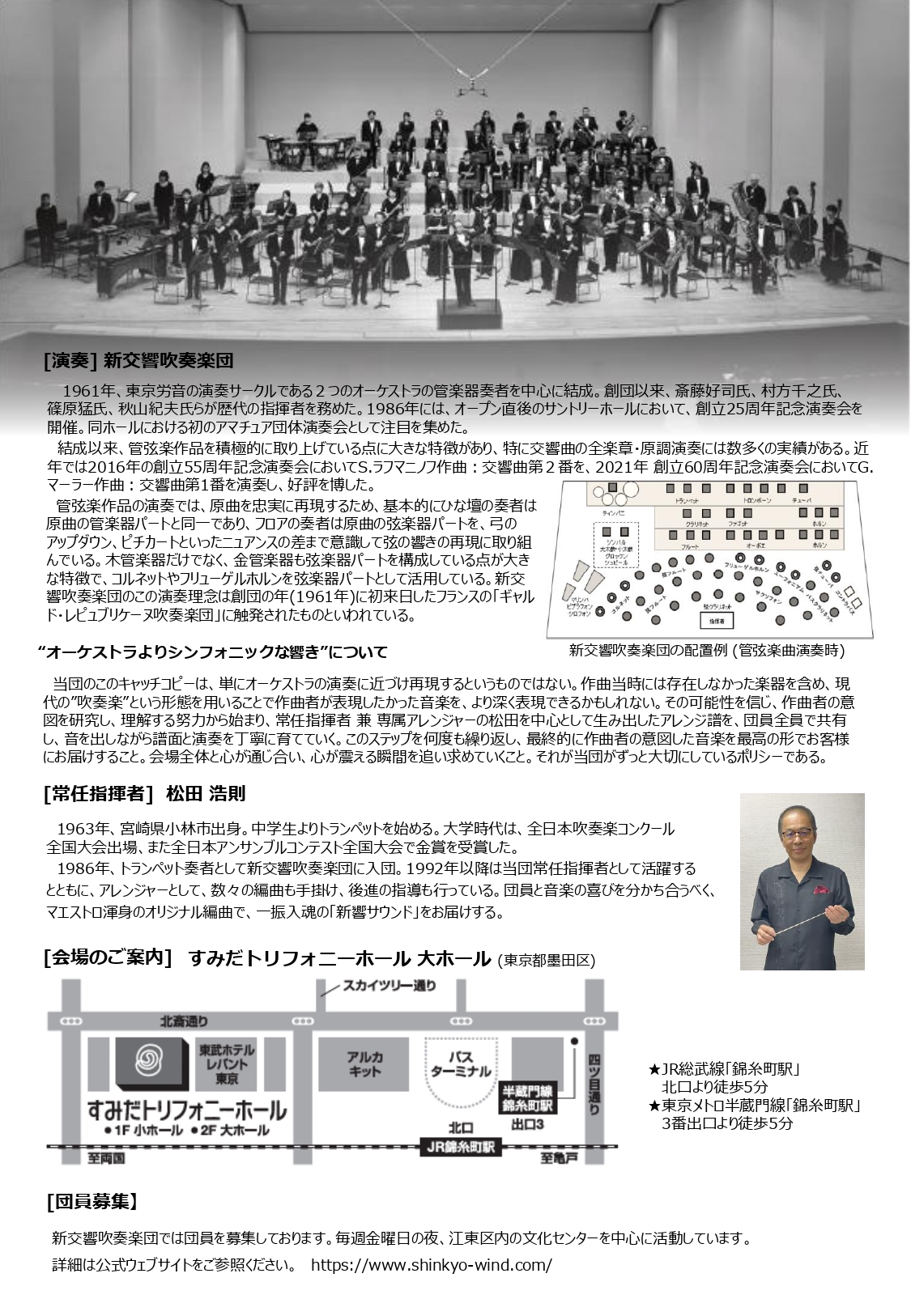 当団のこのキャッチコピーは、単にオーケストラの演奏に近づけ再現するというものではない。作曲当時には存在しなかった楽器を含め、現代の”吹奏楽”という形態を用いることで作曲者が表現したかった音楽を、より深く表現できるかもしれない。その可能性を信じ、作曲者の意図を研究し、理解する努力から始まり、常任指揮者 兼 専属アレンジャーの松田を中心として生み出したアレンジ譜を、団員全員で共有し、音を出しながら譜面と演奏を丁寧に育てていく。このステップを何度も繰り返し、最終的に作曲者の意図した音楽を最高の形でお客様にお届けすること。会場全体と心が通じ合い、心が震える瞬間を追い求めていくこと。それが当団がずっと大切にしているポリシーである。