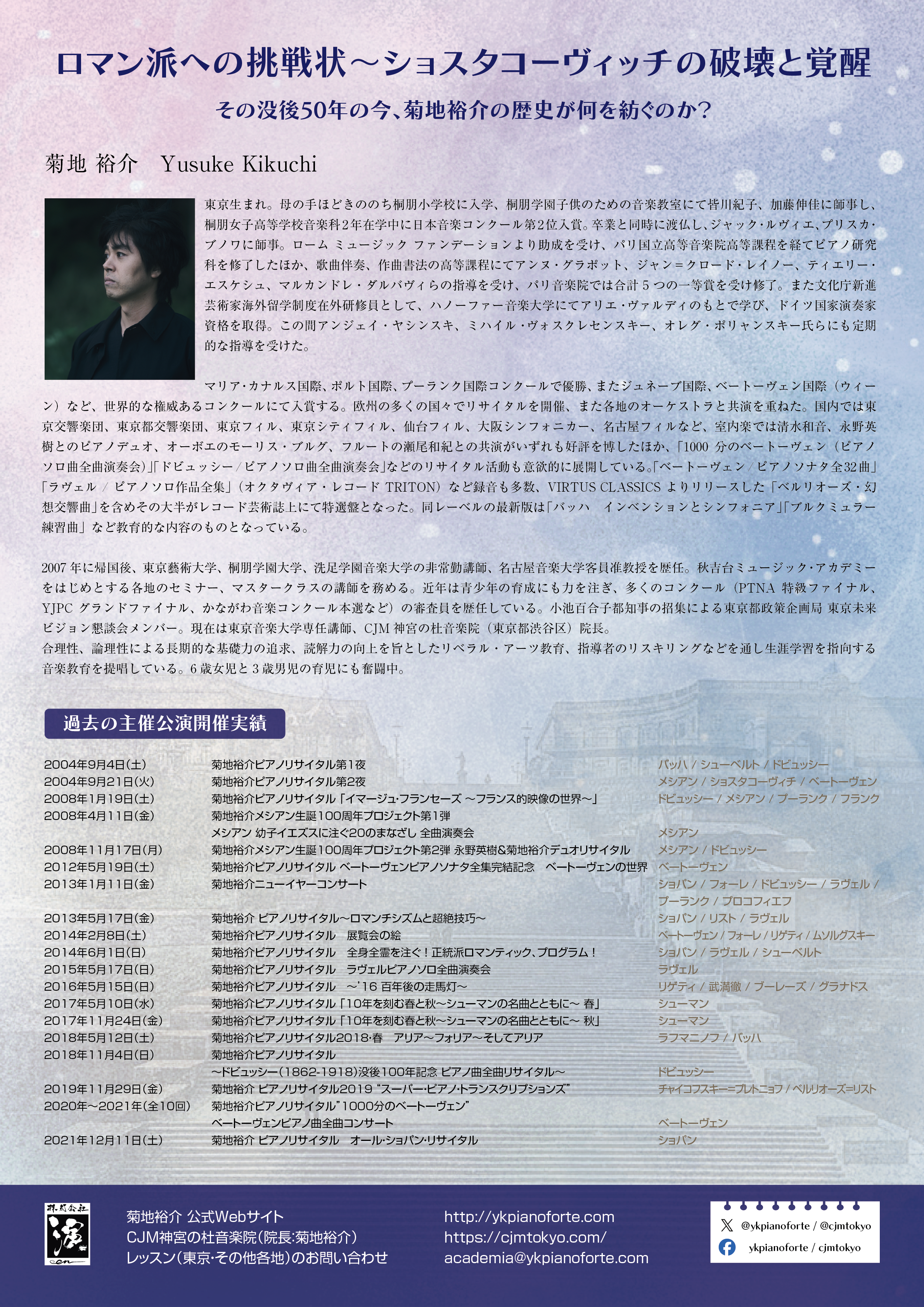 約4年ぶりの本格的なソロリサイタル。主軸に置くのはショスタコーヴィッチ。円熟期を迎えつつある菊地裕介の描くプログラムをお聴き逃しなく!