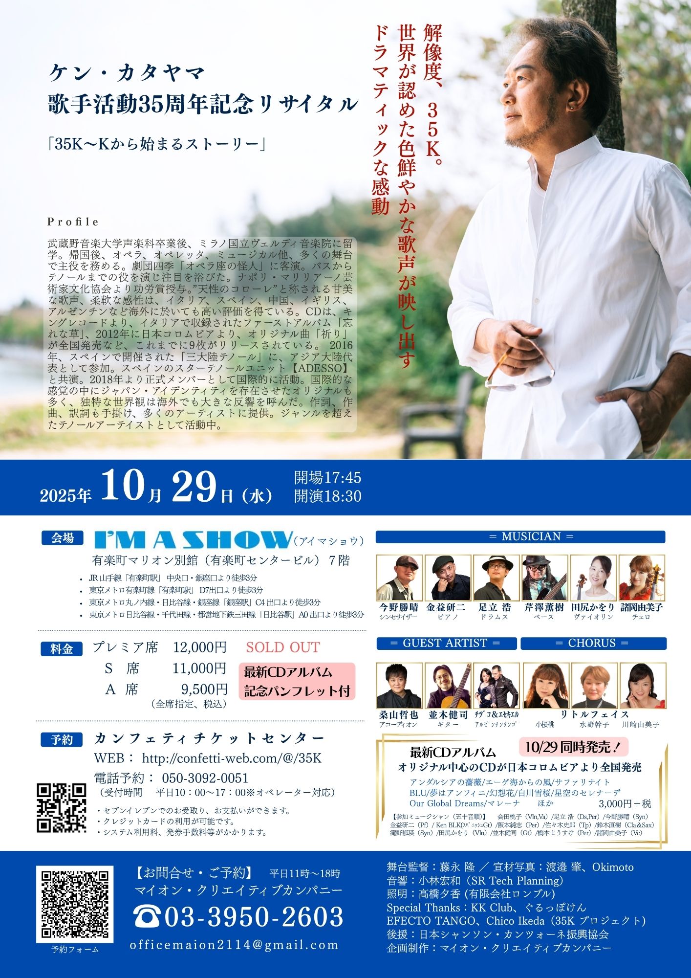 歌手活動35周年を記念しての海外ツアー、イタリアの世界遺産を結び平和を共に願う「祈り-INORI」コンサートで成功を収めたケン・カタヤマ。オリジナル、カンツォーネ、アストル・ピアソラ・・・