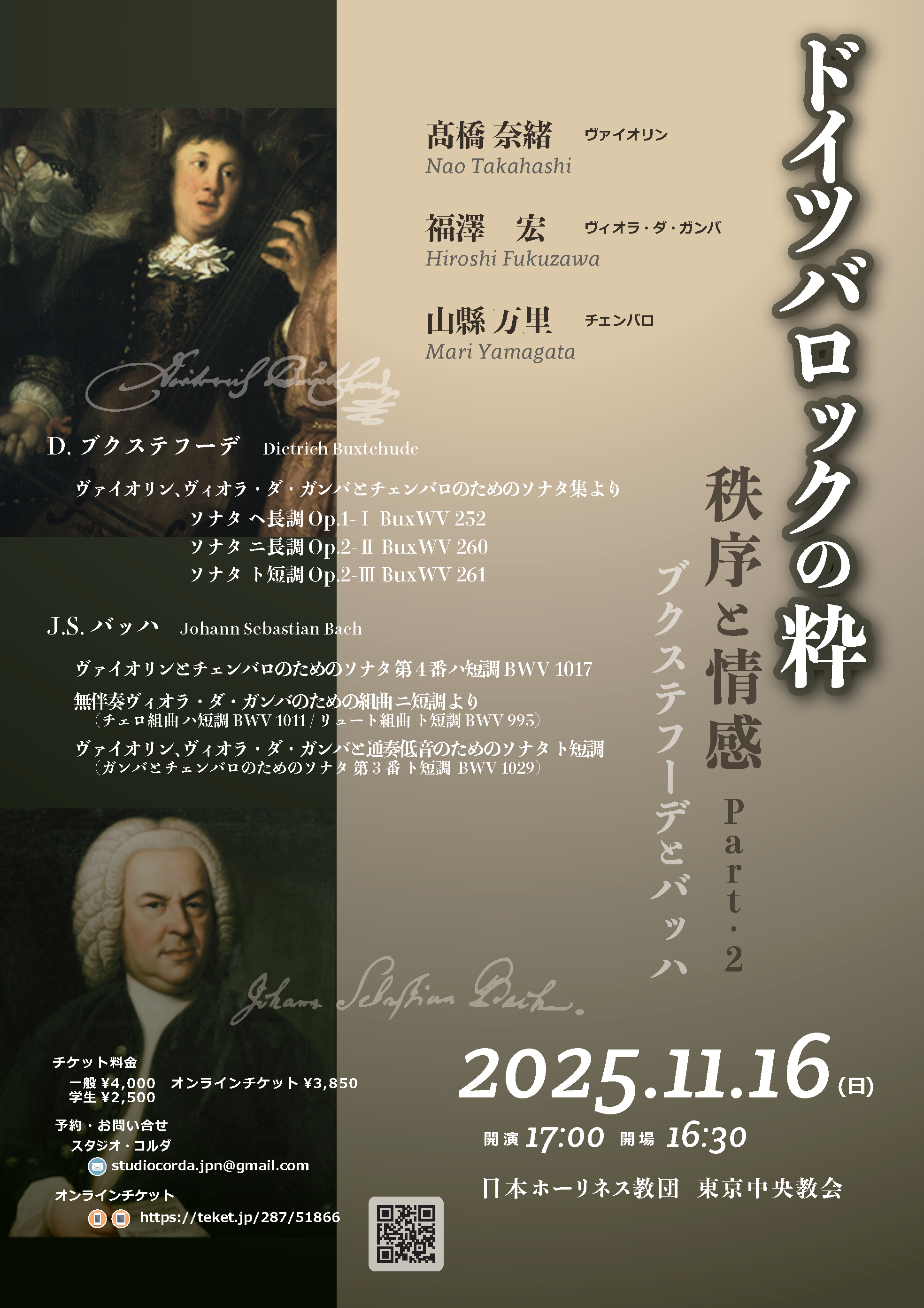 Studio cordaが贈る古楽シリーズ第5回公演では、17世紀ドイツの巨匠ブクステフーデとJ.S.バッハの珠玉のソナタを、ピリオド楽器編成でお楽しみいただきます。