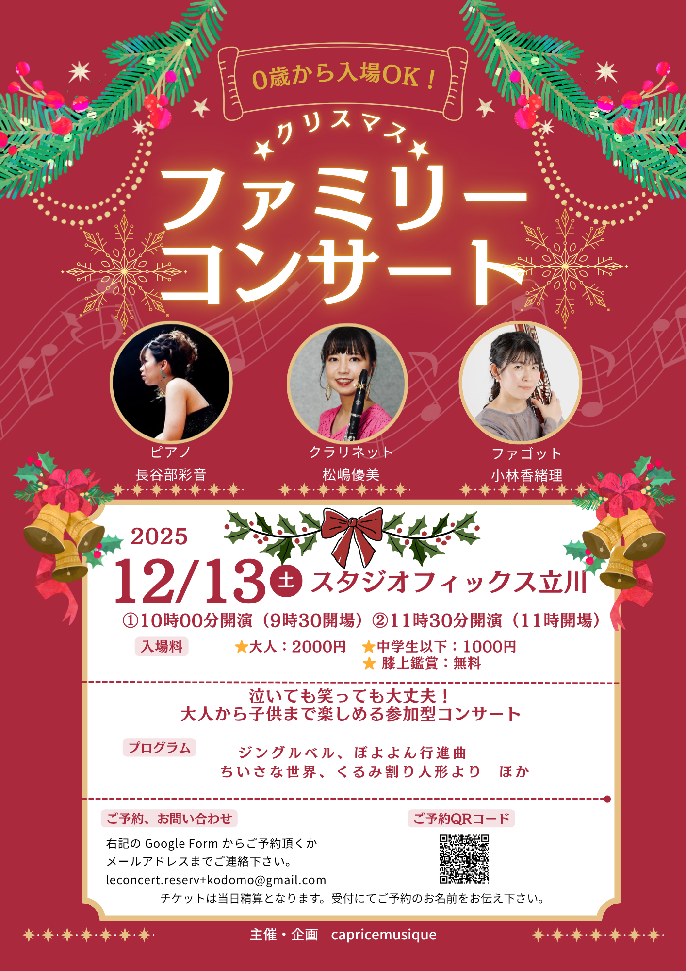 0歳のお子様から、大人まで楽しめるコンサートです。誰もが聞いたことがあるクリスマス曲をプロ演奏家による生演奏でお楽しみいただけます。小さなホールでアットホームな雰囲気ですので、泣いても笑っても大丈夫♪ ホールでの演奏会が初めてのお子様にもぴったりです。