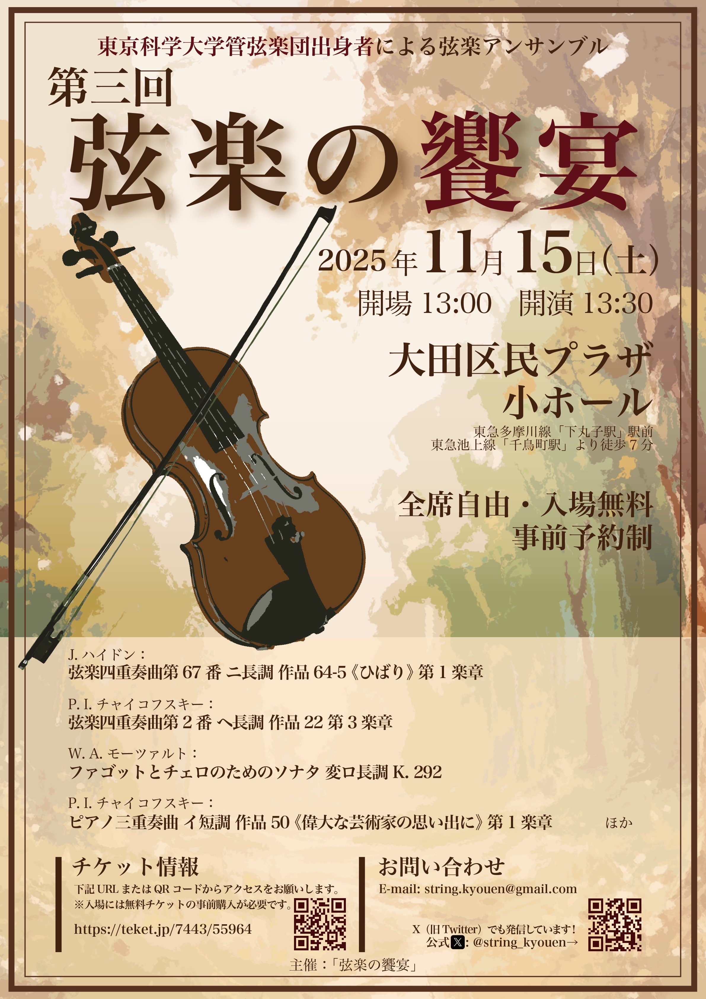 王道の弦楽四重奏から重厚なコントラバス四重奏、管楽器やピアノの加わった華やかなアンサンブルなど、さまざまな響きをお楽しみいただけます。