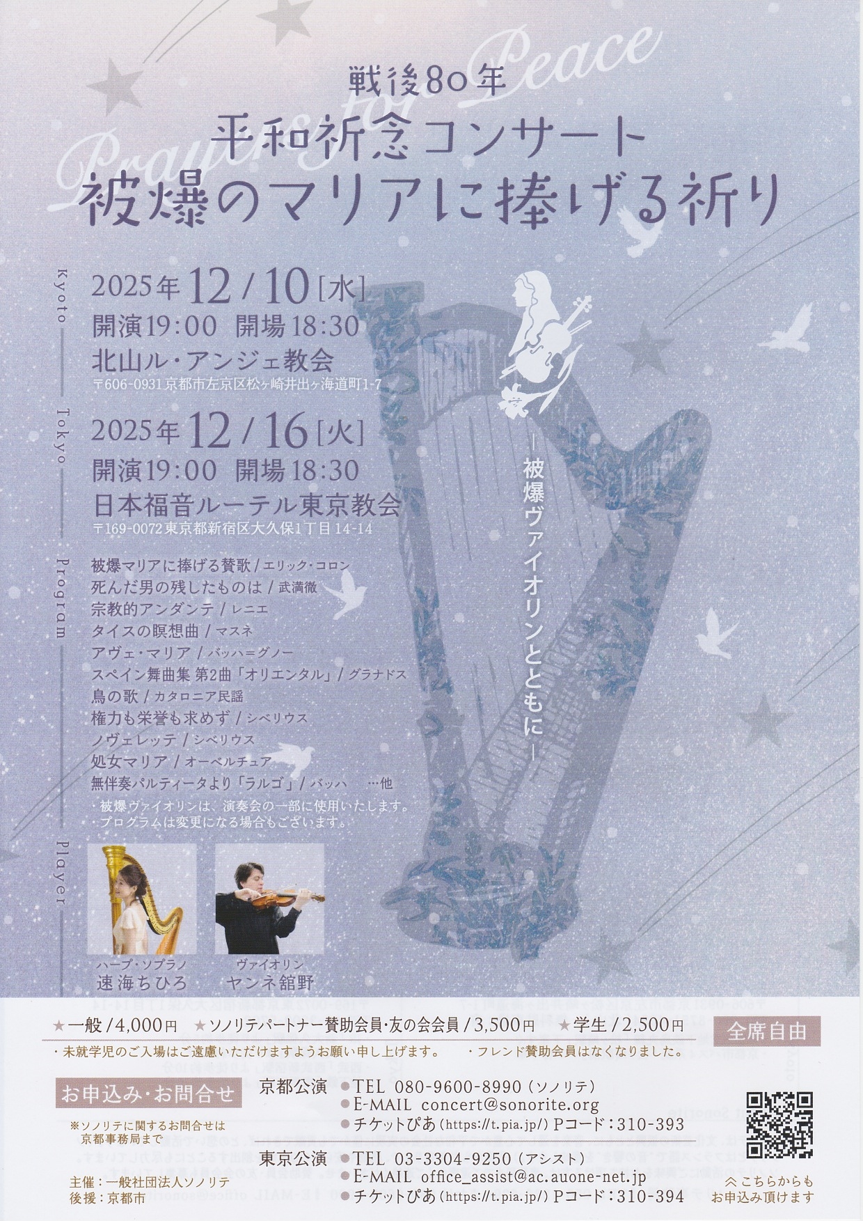 速海ちひろが奏でるハープと歌声、ヤンネ舘野の深みあるヴァイオリンが、被爆マリアへの祈りをテーマに祈念の音楽世界を紡ぎます。エリック・コロンから武満徹、ピアソラ、シベリウスまで幅広い作曲家の名曲を織り交ぜ、平和への想いを豊かな響きで伝えるひとときをお届けします。