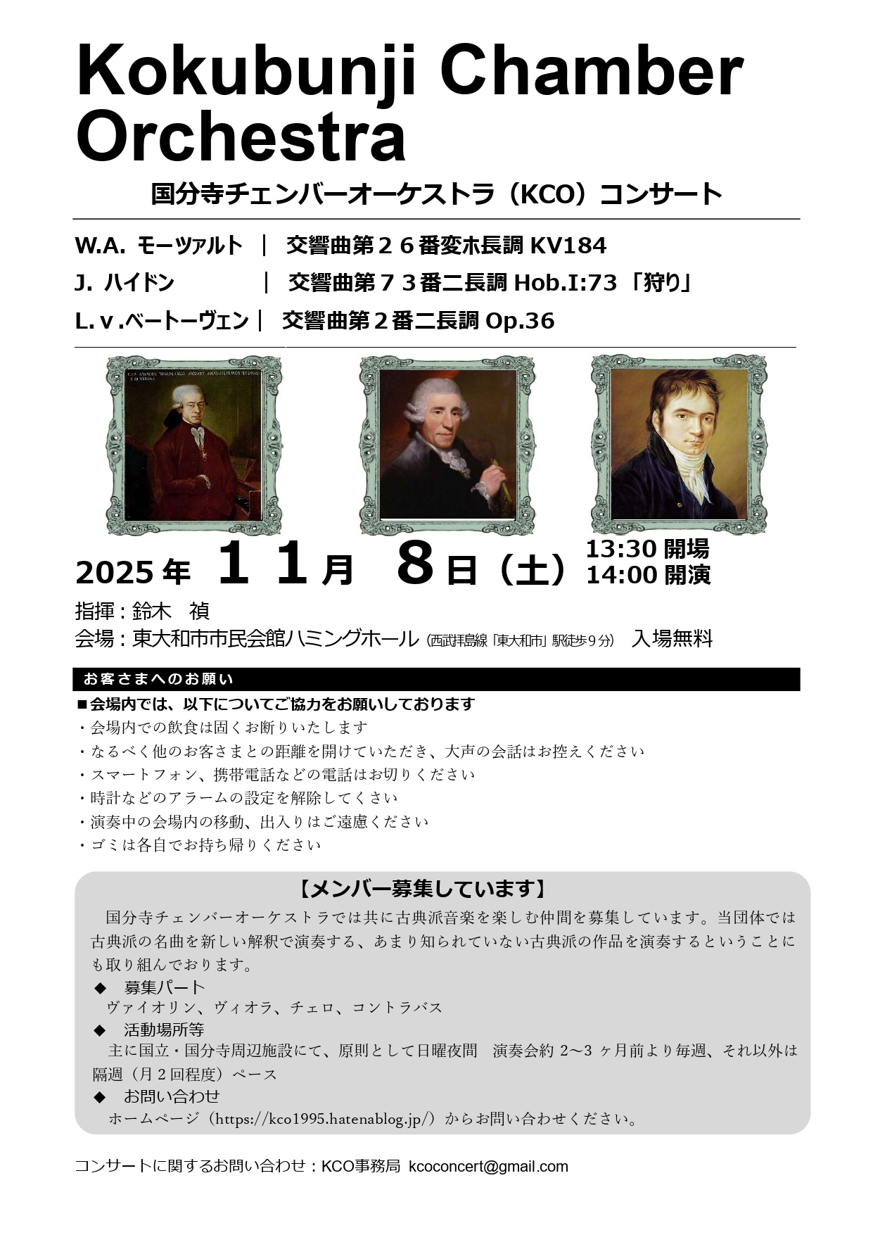 国分寺チェンバーオーケストラでは共に古典派音楽を楽しむ仲間を募集しています。当団体では 古典派の名曲を新しい解釈で演奏する、あまり知られていない古典派の作品を演奏するということにも取り組んでおります。