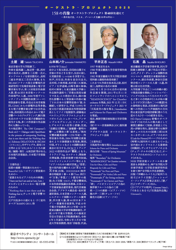 オーケストラ・プロジェクトは、新しいオーケストラ作品の創造と発表のための運動を展開するという共通の目的意識を持って集った作曲家によるグループで、4人の作曲家が新作オーケストラ曲を世界初演する演奏会を年に1回開催して来ました。今回はオーケストラ・プロジェクト第40回公演という記念すべき一夜です。平井正志の繊細かつ鮮烈なピアノ協奏曲『セイレーンの島』、山本純ノ介の独奏クラリネットとオーケストラが織り成す新たな時空間『光の中の二つの時』、土屋雄による躍動するヴァイオリン協奏曲『第二の声』、そして石黒晶がオペラ『みすゞ』から紡ぐ合唱と独唱による壮麗な『みすゞの誕生』。大井剛史と樋本英一(石黒作品のみ)の指揮、東京フィルハーモニー交響楽団の演奏で、現代音楽の多彩な音色が響き合う充実のプログラムをお届けします。