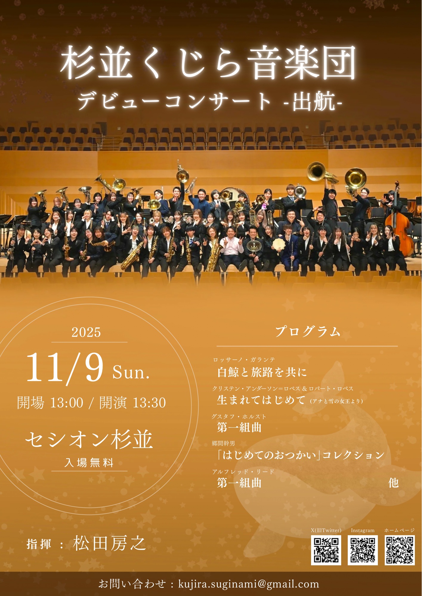 杉並くじら音楽団が待望のデビューコンサート「出航」を開催します。セシオン杉並ホールにて、壮大な物語を感じさせる「白鯨と旅路を共に」や、心躍る旋律の「生まれてはじめて」、そして「第一組曲」を含む多彩なプログラムを無料でお届けします。地域に根ざしたアマチュア団体ならではの温かい響きと熱意あふれる演奏が、聴衆を未知の音楽世界へと誘います。世代を問わずどなたでもお楽しみいただけますので、ぜひご来場ください。