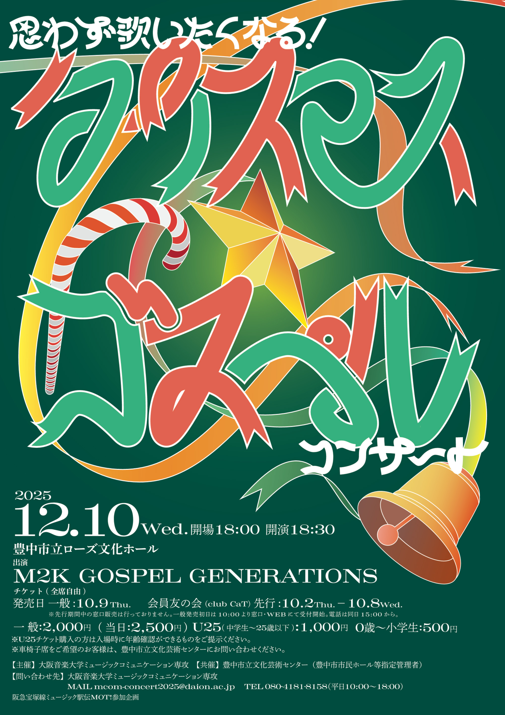 大阪音楽大学ミュージックコミュニケーション専攻の学生が企画する「思わず歌いたくなる!クリスマス・ゴスペルコンサート」。M2K GOSPEL GENERATIONSによる心揺さぶるゴスペルナンバーが、温かなローズ文化ホールに響き渡ります。小さなお子様から大人まで、みんなで一体となりSilent NightやBethlehem Morning、Now Behold The Lambなどを歌いながら、クリスマスの喜びと温もりを感じるひとときをお届けします。家族や友人と気軽に楽しめるコンサートです。