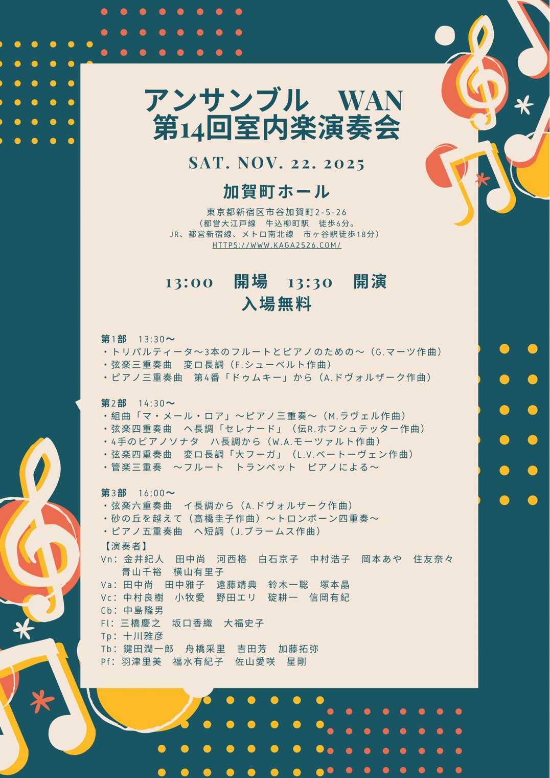 慶應義塾ワグネル・ソサィエティー・オーケストラ、アマデウス・ソサィエティー管弦楽団のOBや、そのほか有志によるグループ「アンサンブルWAN」による室内楽コンサートです。 弦楽器、木管、金管楽器、ピアノなど様々な組み合わせによる室内楽コンサートを年2回開催しています。 編成も曲目もバラィエティに富んでいて、室内楽の楽しさを共有頂けると思います。 今回は曲目が多く4時間のロングランコンサートですが、好みの曲、演奏のみ聞いていただく事も可能です。 11月22日(土) 加賀町ホールで13:30開演、入場無料です(最寄駅 都営大江戸線 牛込柳町駅)。