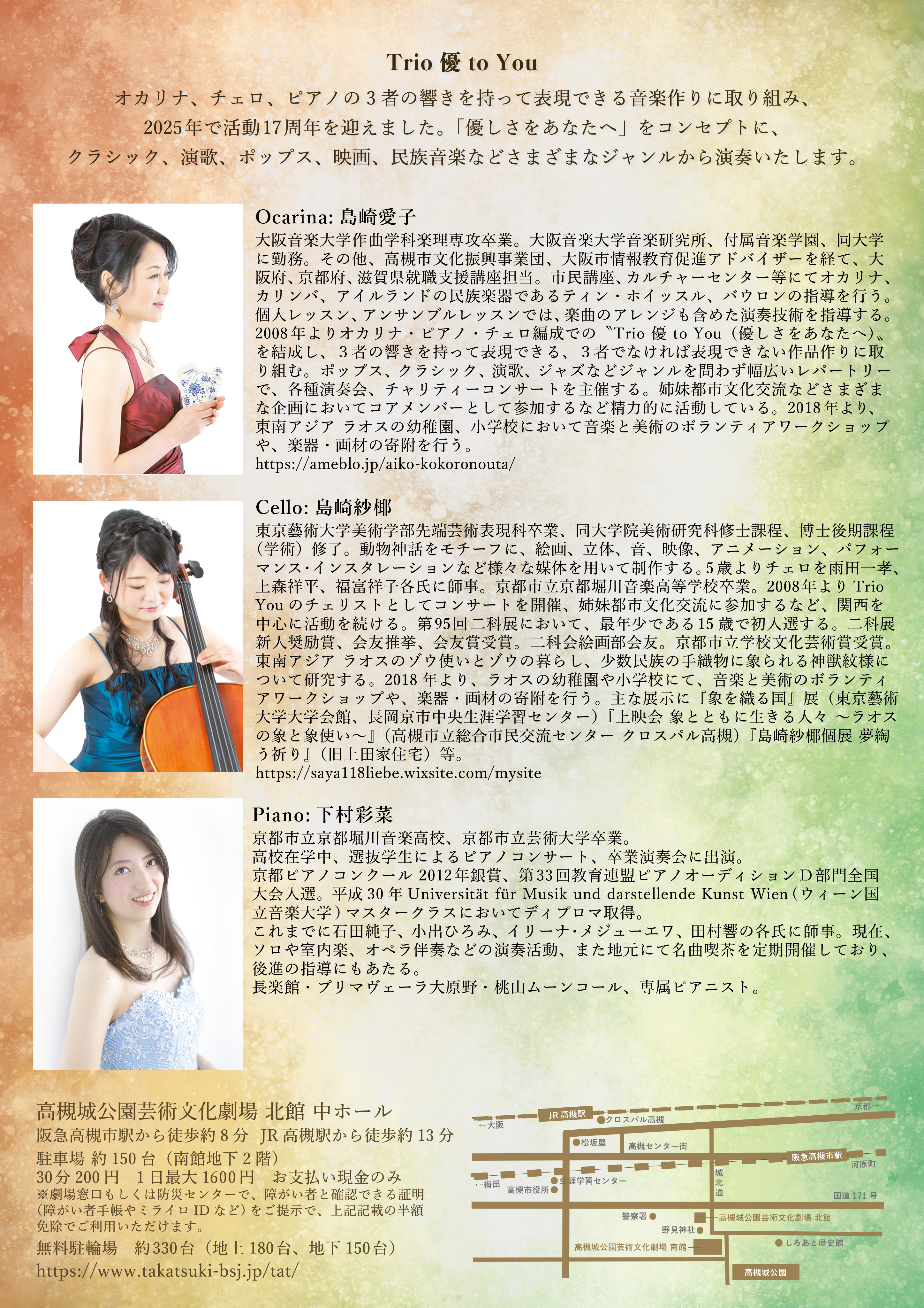 オカリナ/ティンホイッスル・チェロ・ピアノからなる「Trio You」は、クラシック、ポップス、演歌、民謡、アイリッシュ、映画、ゲーム音楽など、多様なレパートリーを揃え、関西を中心に活動を続けて参りました。