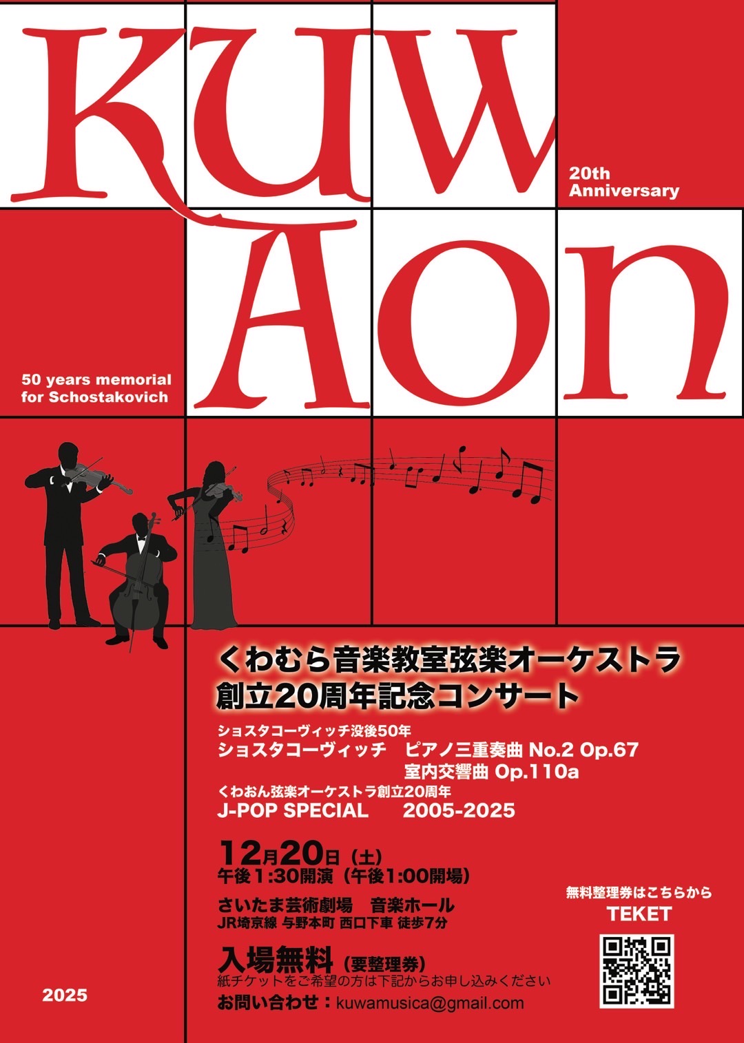 ショスタコーヴィッチ没後50周年を記念した「ピアノ三重奏曲」「室内交響曲」のほか、2005年~2025年までのJ-POPのヒット曲を演奏します。