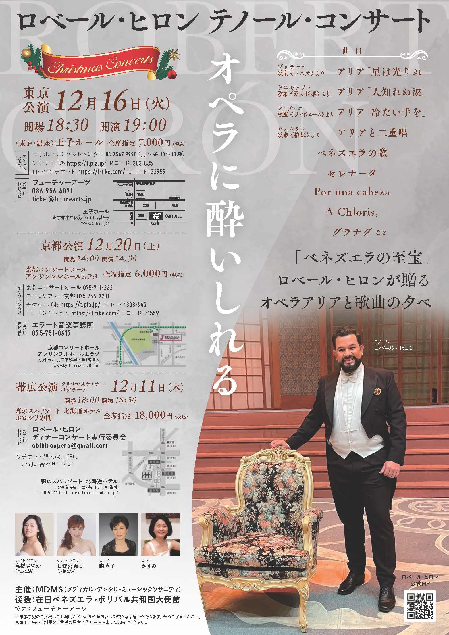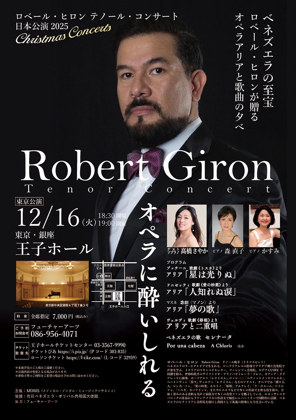 日本人ソプラノ歌手をゲストに迎え、「星は光りぬ」「人知れぬ涙」などオペラアリアのほか、歌曲およびベネズエラの歌など、珠玉の名曲プログラムによるコンサート。“ベネズエラの至宝”とも称される「ロベール・ヒロン」の歌声をご期待ください!!