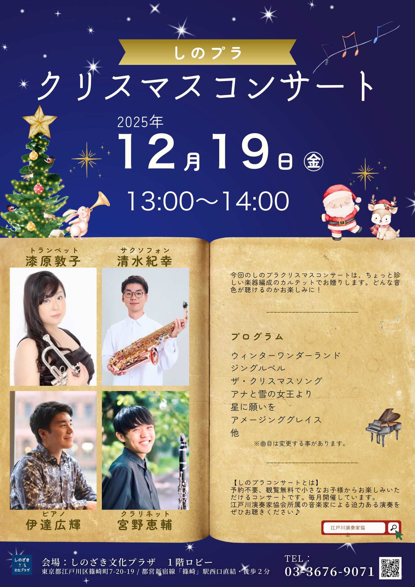 2025年12月19日13時よりしのざき文化プラザ1階ロビーにて、宮野恵輔(クラリネット)、清水紀幸(サックス)、伊達広輝(ピアノ)、漆原敦子(トランペット)の四重奏が織りなすクリスマスコンサートをお楽しみいただけます。息の合ったアンサンブルと季節の装飾に包まれ、柔らかな音色が聴衆を心温まる世界へと誘います。