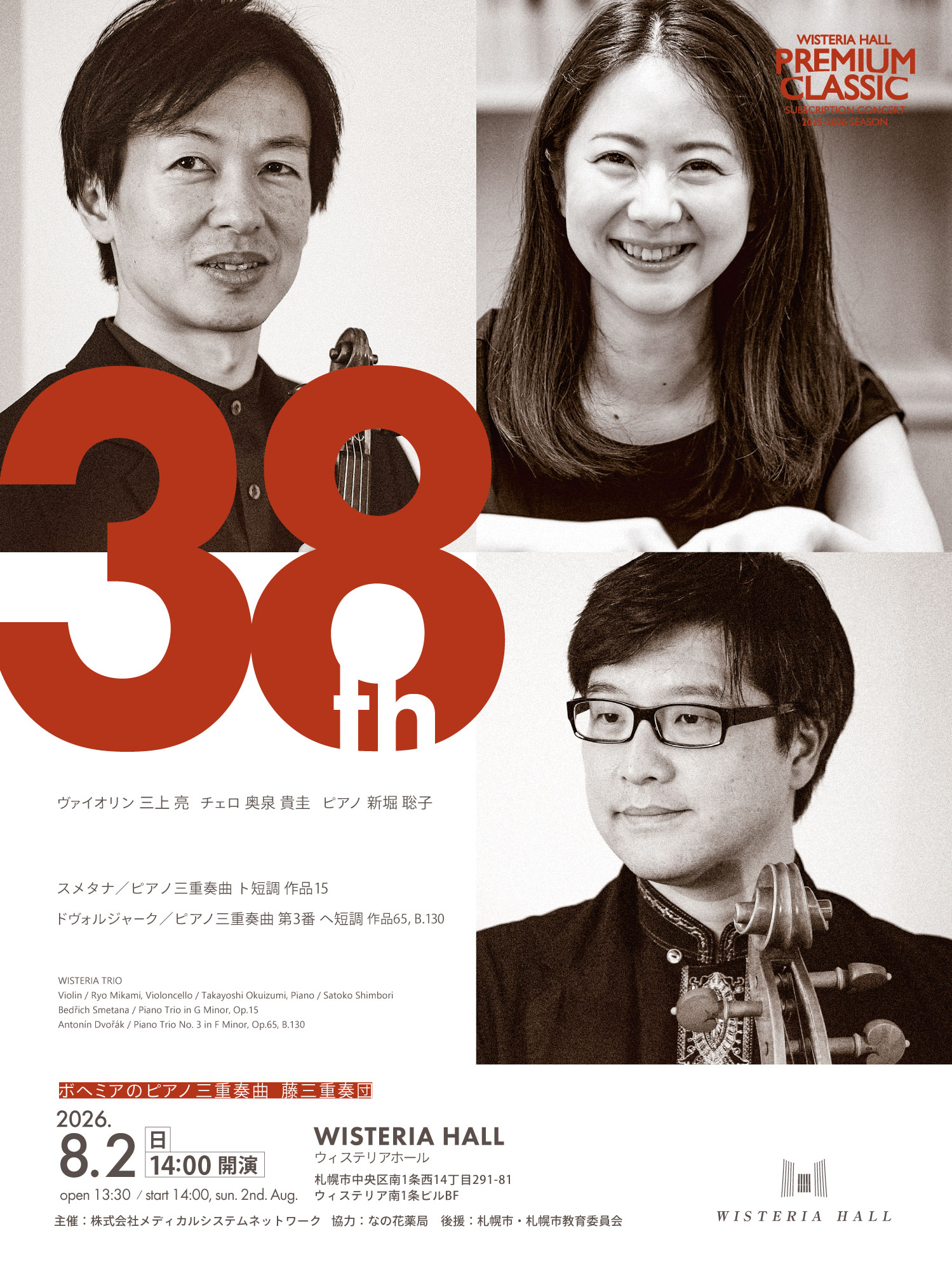 札幌ウィステリアホールのPREMIUM CLASSIC 38thに藤三重奏団が登場します。三上亮(ヴァイオリン)、奥泉貴圭(チェロ)、新堀聡子(ピアノ)が、スメタナのピアノ三重奏曲ト短調作品15とドヴォルジャークのピアノ三重奏曲第3番ヘ短調作品65を演奏します。緻密なアンサンブルと深い表現で、名曲の対比と文学的な情感を丁寧に描き出すプログラムです。丁寧な演奏で室内楽の魅力を堪能できる公演です。