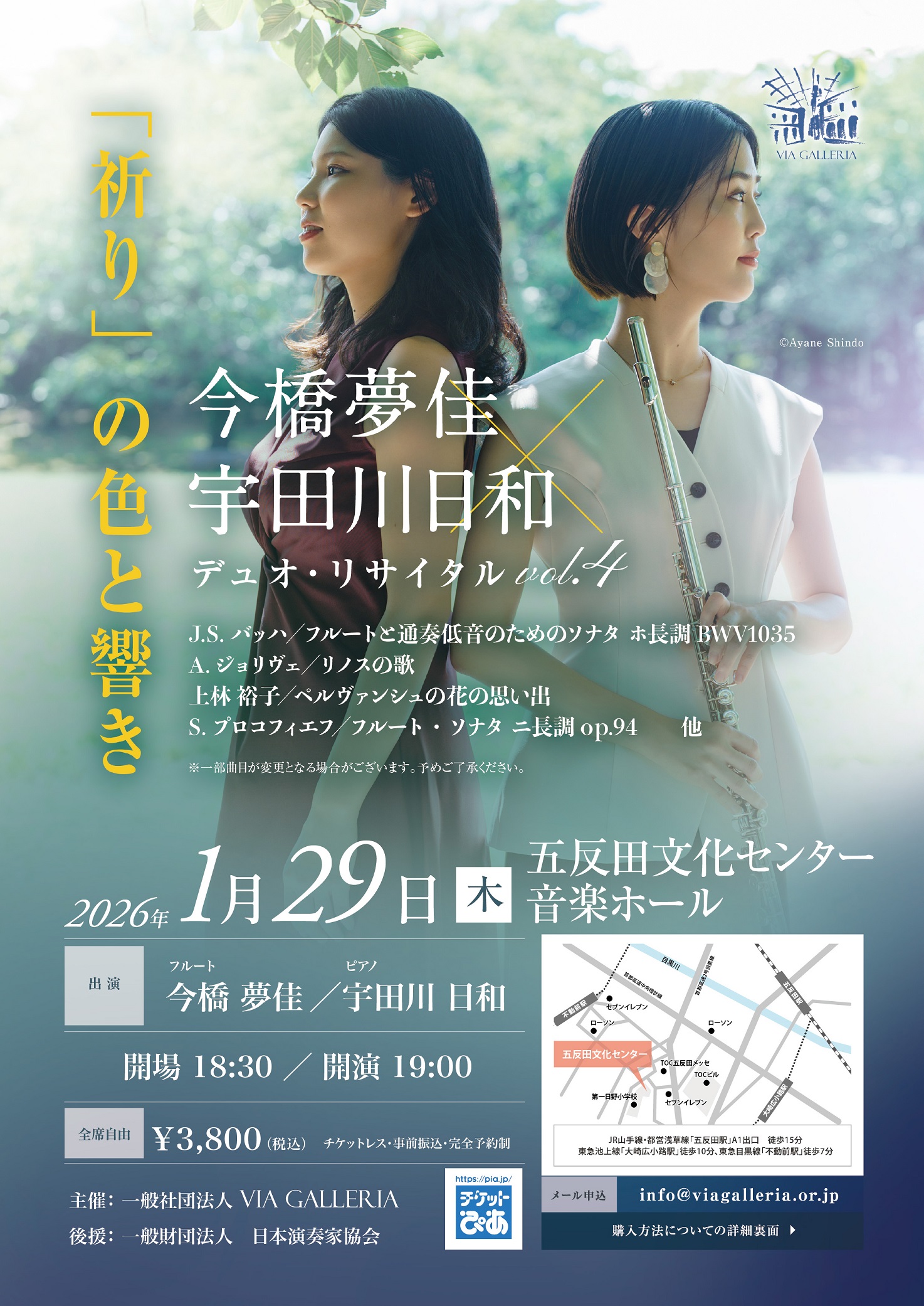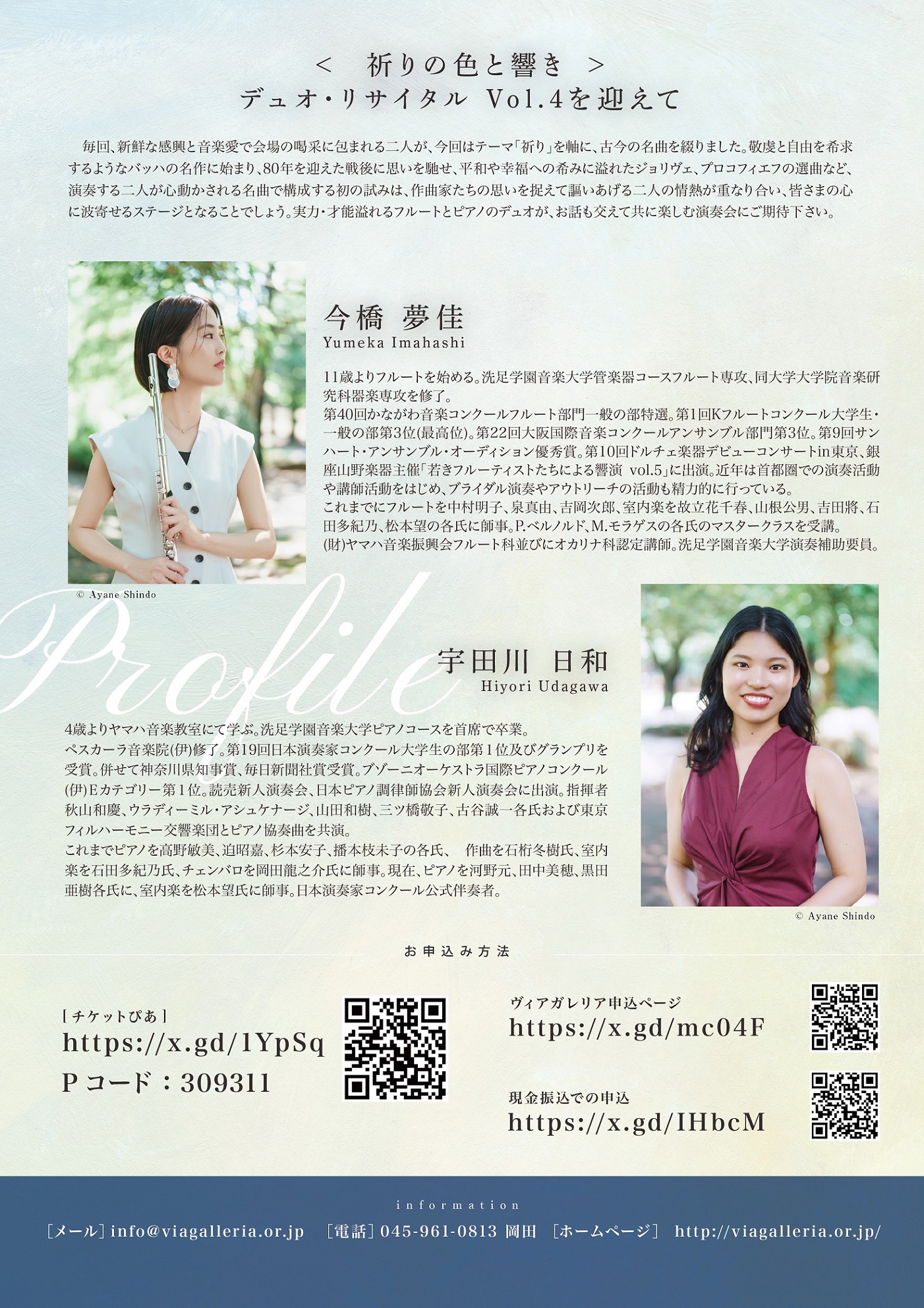 今橋夢佳(フルート)と宇田川日和(ピアノ)によるデュオ・リサイタルvol.4「祈りの色と響き」は、テーマに“祈り”を据え、バッハのソナタBWV1035やジョリヴェの「リノスの歌」、プロコフィエフのフルートソナタop.94など古今の名曲を選曲したプログラムです。二人の瑞々しいアンサンブルが描き出す静謐な祈りの姿と、自由を希求する作曲家の情熱が重なり合い、聴き手の心に深い共鳴を呼び起こします。お話を交えた演奏で、音楽の魅力をより身近に感じていただけることでしょう。