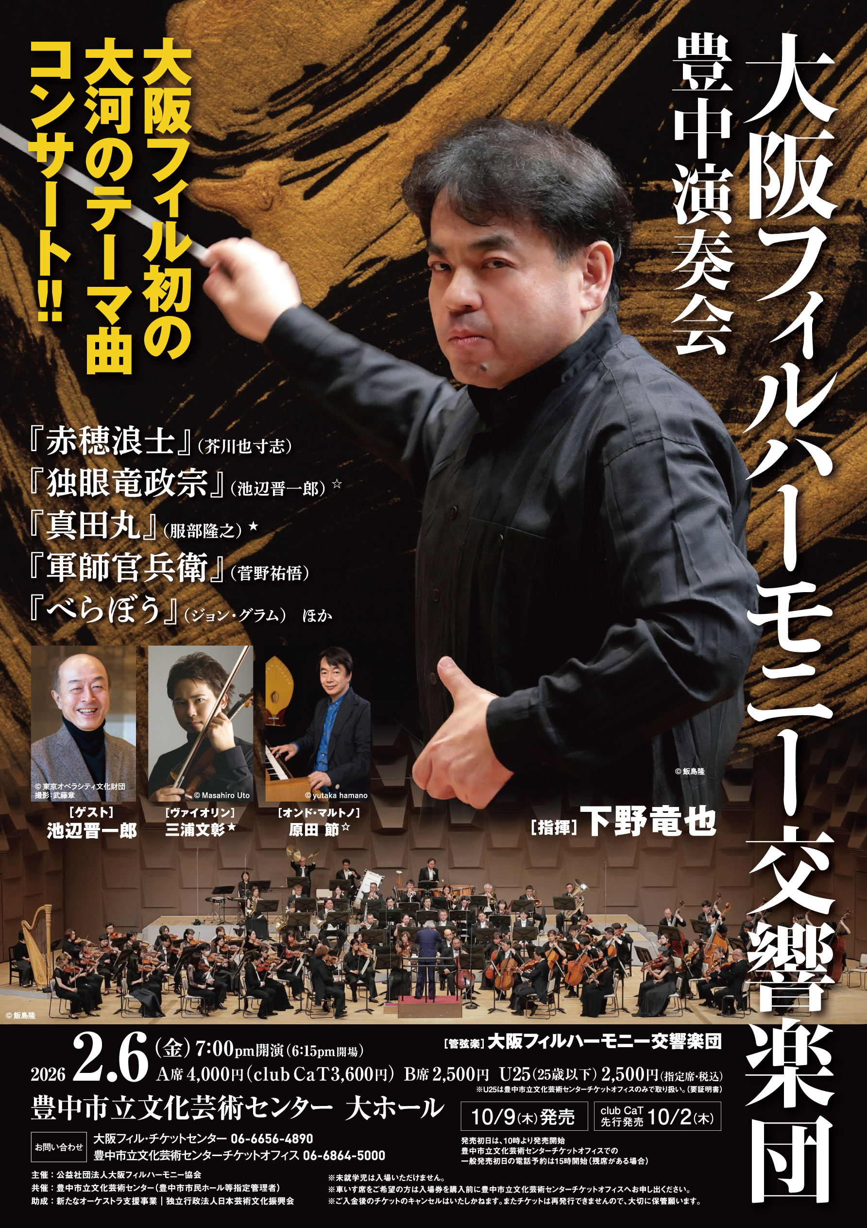 大阪フィルハーモニー交響楽団が下野竜也の指揮で大河ドラマの名曲を次々と披露します。三浦文彰のヴァイオリン独奏や原田節のオンド・マルトノ独奏、池辺晋一郎のゲスト出演も実現。芥川也寸志「赤穂浪士」、服部隆之「真田丸」など、迫力あるサウンドが豊中市立文化芸術センター大ホールに響き渡ります。