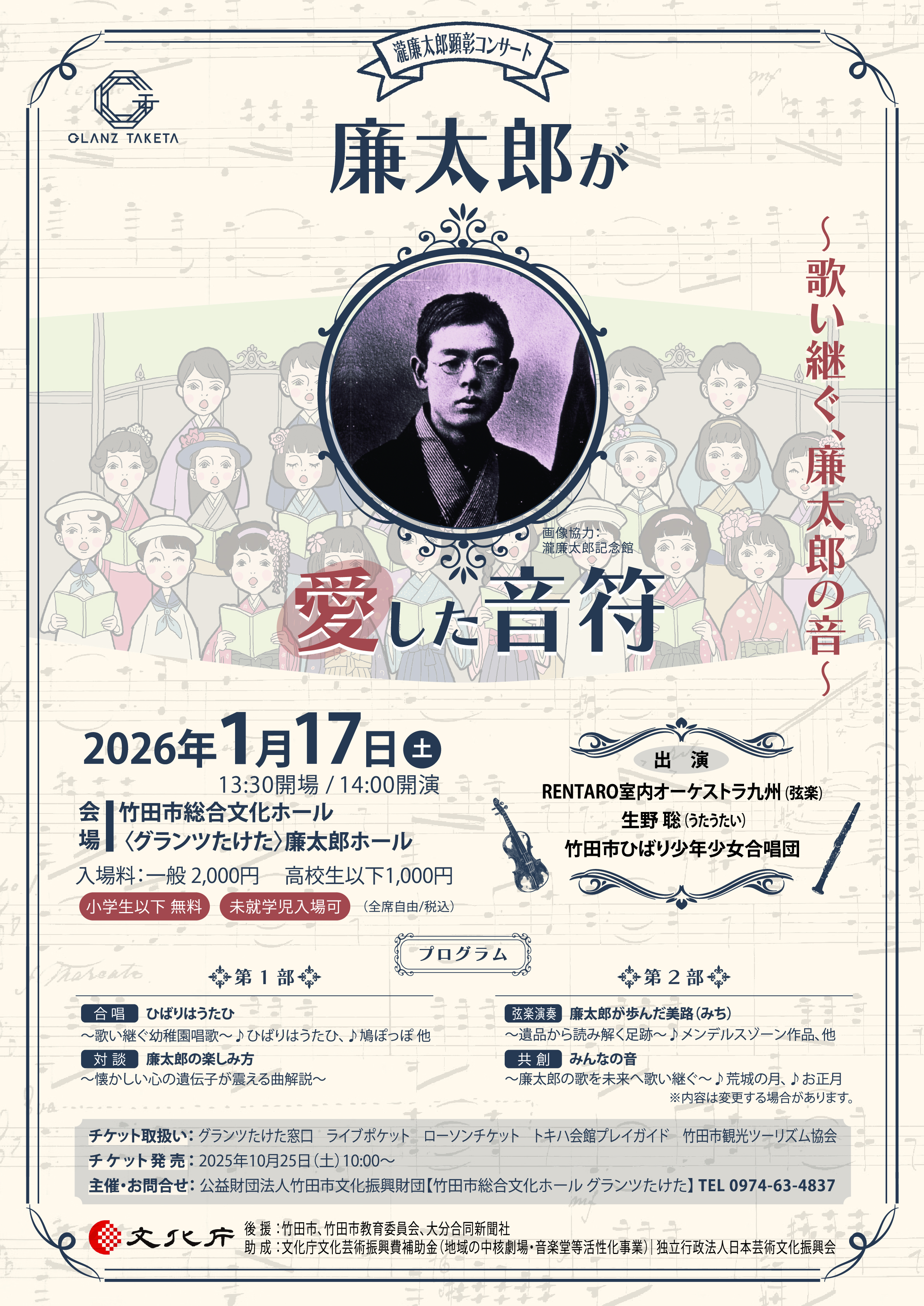 グランツたけたでは、2026年1月17日(土曜日)に瀧廉太郎顕彰コンサート「廉太郎が愛した音符」を開催します。