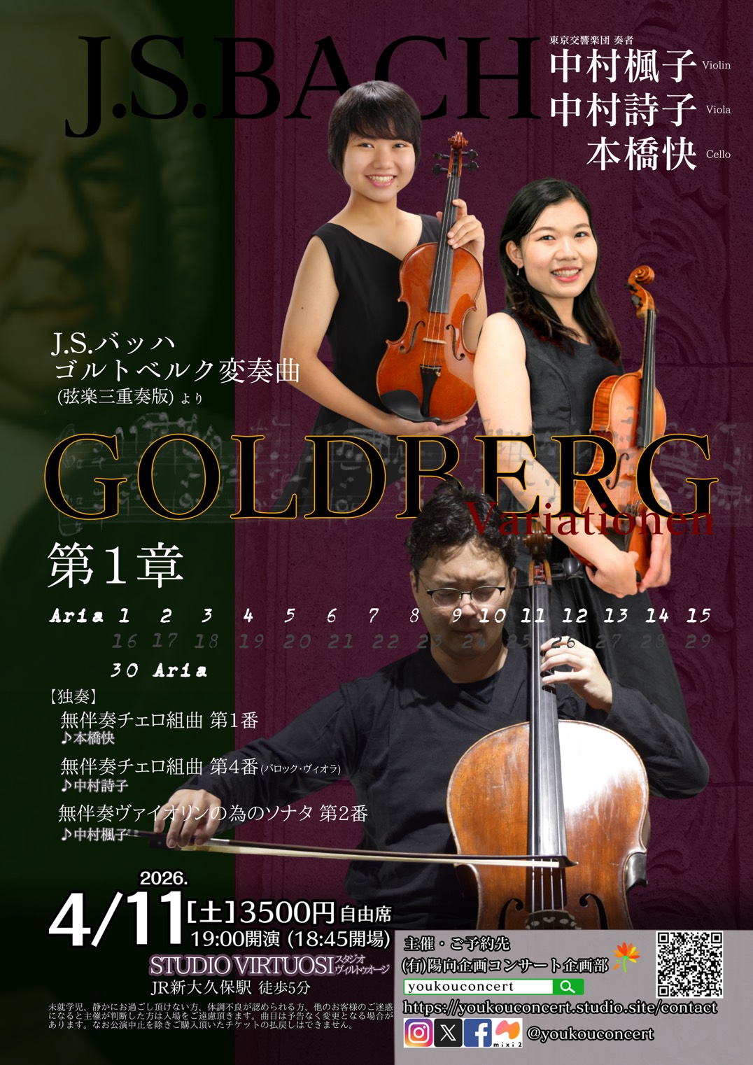 各奏者の独奏曲に続けて、バッハの最高傑作と呼び声も高い『ゴルトベルク変奏曲(弦楽三重奏版より)』を演奏致します。