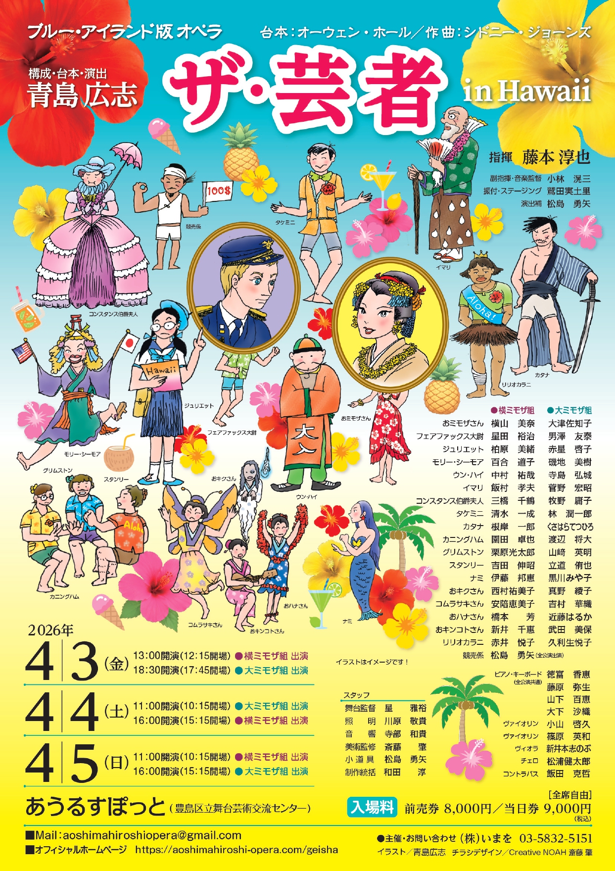 しかし音楽がやや卑俗であること、出演者に独唱が少ないこと、合唱がやたらに多いことなどから、常の公演よりも大掛かりな改変が必要だと考え、舞台を19世紀末の日本(つまり開国したばかり)ではなく、14年のハワイに設定し、西洋人の多くをイギリス人ではなくアメリカ人に変え(英語圏ではある )、人物設定を掘り下げた結果、芸者たちは幻想世界の住人になりました。