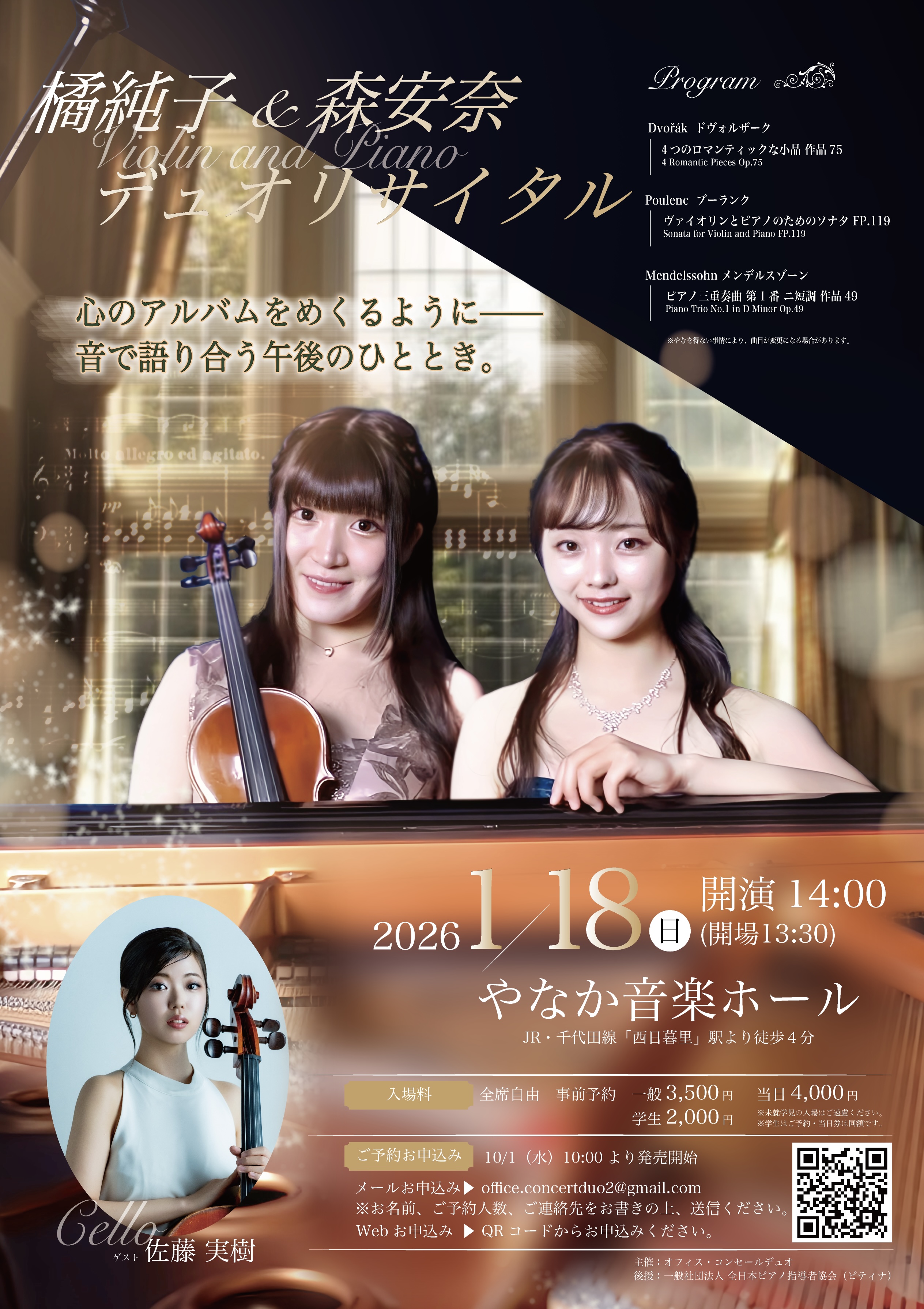 後半にはチェリスト・佐藤実樹さんをお招きし、ピアノ三重奏の豊かな響きをお届けします。室内楽ならではの深い対話と織りなすアンサンブルを、どうぞお楽しみください。