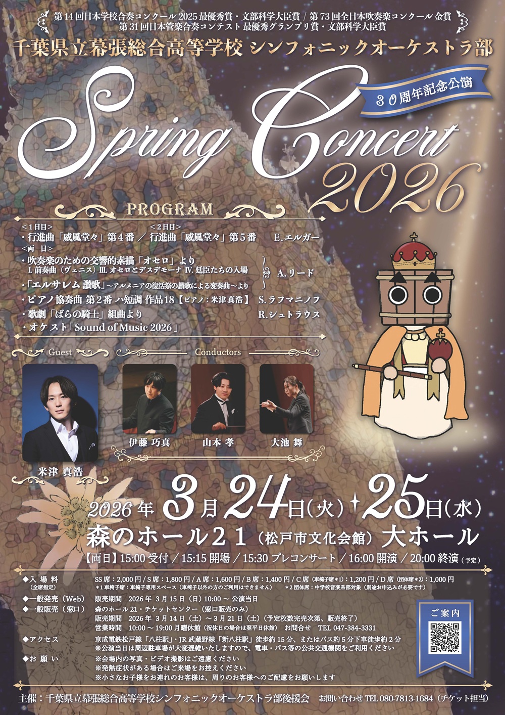 今年度を締めくくる本公演は、第30周年記念公演となり、ソリスト 米津 真浩氏との「ピアノ協奏曲 第2番 ハ短調 作品18」をはじめ、ステージパフォーマンスとミュージカル等を融合させたオリジナルショー“オケスト”「Sound of Music 2026」、全日本吹奏楽コンクールで披露した『吹奏楽のための交響的素描「オセロ」より I.前奏曲(ヴェニス)Ⅲ.オセロとデスデモーナ Ⅳ.廷臣たちの入場』など、多彩なプログラムをお楽しみいただけます。
