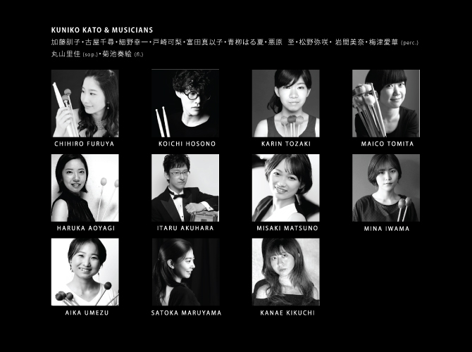 Instrumentations: Four pairs of tuned bongo drums, Three marimbas, Three glockenspiels, Soprano and alto voices, Whistling and piccolo