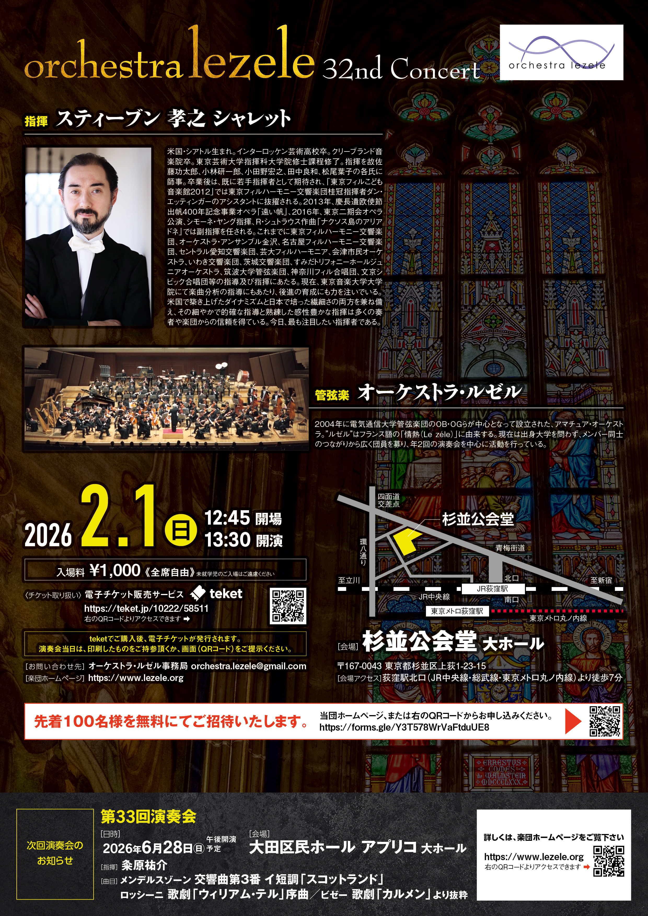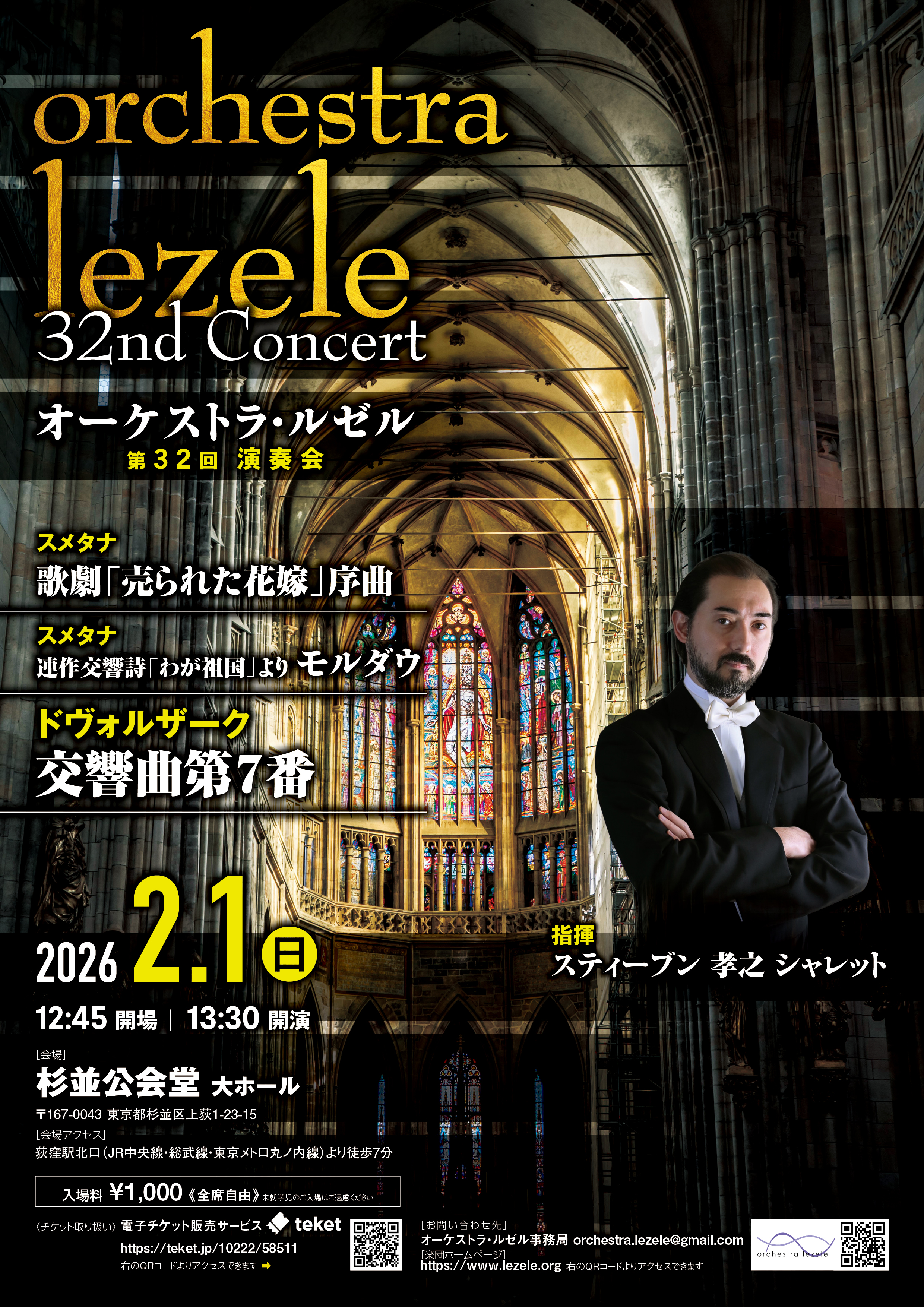 杉並公会堂大ホールを舞台にオーケストラ・ルゼルが贈る第32回演奏会。指揮にスティーブン・孝之・シャレット氏を迎え、スメタナの歌劇『売られた花嫁』序曲と連作交響詩『わが祖国』より〈モルダウ〉、さらにドヴォルザーク交響曲第7番をプログラムに掲げた豪華な内容です。ボエミアの風薫る2人の作曲家の世界を、磨き上げた演奏でお楽しみください。