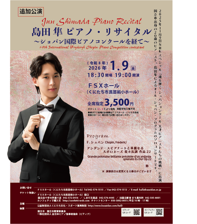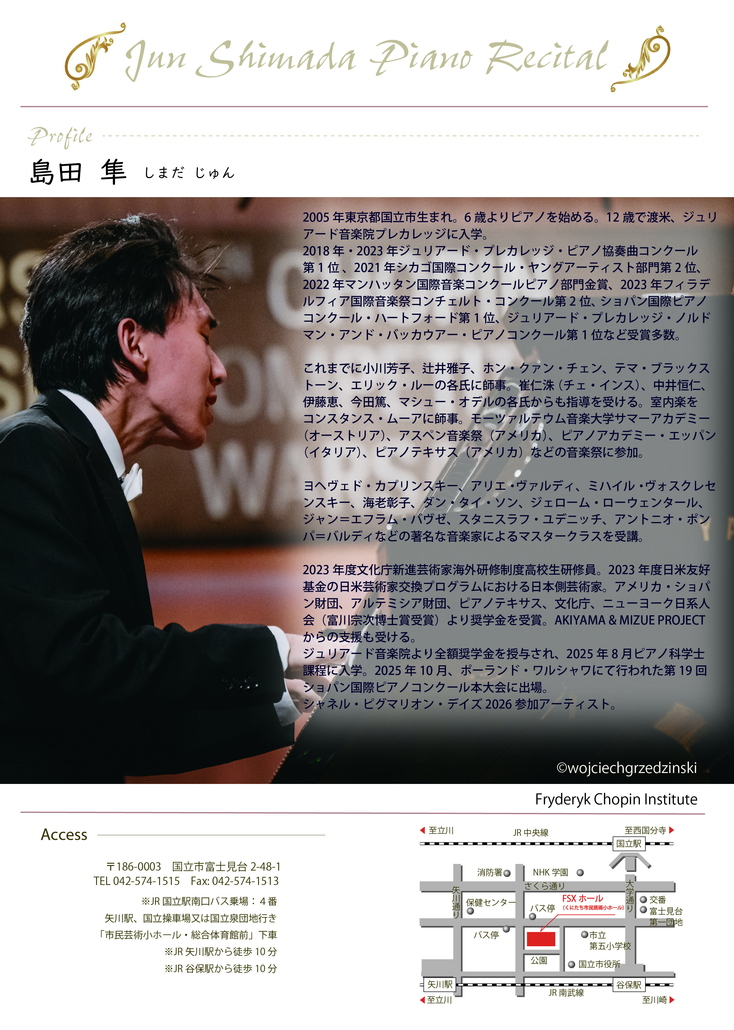 ショパン国際ピアノコンクール本大会出場を果たした国立市出身の20歳、島田隼による待望の追加公演。純度の高い技巧と豊かな音楽性が融合したオール・ショパンプログラムで、〈アンダンテ・スピアナートと華麗なる大ポロネーズ〉をはじめ、幻想的な夜想曲や華麗なポロネーズなど、聴きどころあふれる名曲が続きます。観る者を魅了する深い詩情と華やかな旋律のコントラストをお楽しみください。