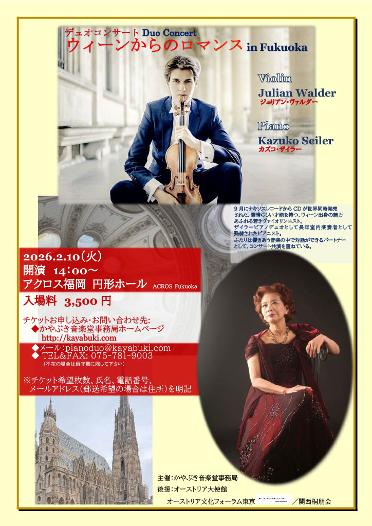 2026年2月10日福岡にて、ヴァイオリンニストのジュリアン・ヴァルダーとピアニストのカズコ・ザイラーが待望のデュオコンサートを開催します。京都新聞でも評価された情緒豊かな旋律は、その繊細さと深い表現力で聴衆を魅了してきました。二人の息の合った演奏は、音楽の持つ温かなぬくもりと響きを存分に伝え、美しいハーモニーが心を満たすひとときをお届けします。