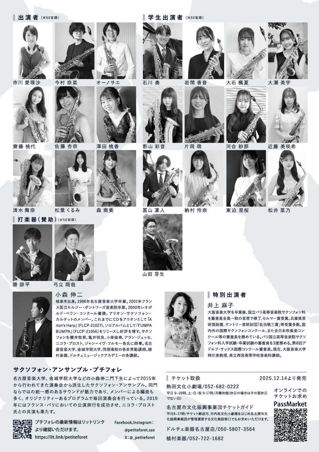 名古屋音楽大学、金城学院大学などの小森伸二門下生によって2015年から行われてきた演奏会から派生したサクソフォン・アンサンブル。 同門ならではの統一感のあるサウンドが魅力であり、メンバーによる編曲も多く、オリジナリティーあるプログラムで毎回演奏会を行なっている。 2019年にはフランス・パリにおいての公演旅行を敢行し好評を博した。 今回は記念すべき第10回目という事で、ゲストに大阪から井上麻子氏を招き、小森伸二とバッハの「2つのバイオリンの為の協奏曲」を演奏するほか、生誕、没後〜周年の作曲家の作品を取り上げていく。