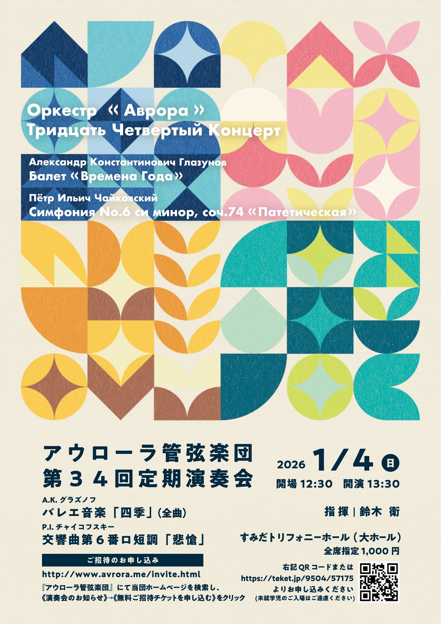 季節の移り変わりを大事に愛でてきた歴史と文化を持つ私たち日本人にとって、「四季」とは生活に欠かせない「人生の彩り」ではないでしょうか。私たちアウローラ管弦楽団が新春の演奏会で最初に取り上げるのは、そんな大切な感性を音に託し、音楽に生命の彩りを吹き込んだ、グラズノフのバレエ音楽「四季」となります。幻想的な冬に始まり、来たるべき春を祝い、生命溢れる夏を謳い、収穫の秋を共に喜ぶ、そんな自然と人生の四季折々を鮮やかに描いた美しい「音楽絵巻」をお楽しみ頂けたらと思います。