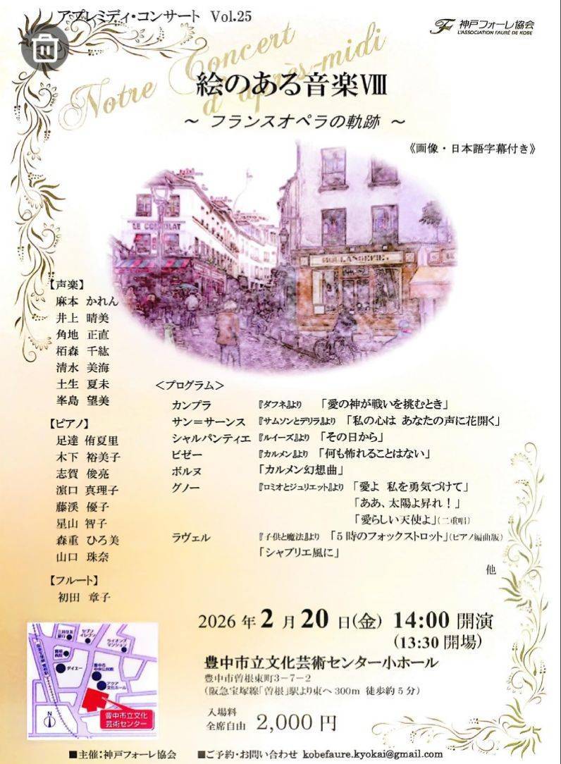 豊中市立文化芸術センター小ホールにて開催される「絵のある音楽Ⅷ」は、フランス・オペラの名アリアや幻想曲を、映像と日本語字幕つきで楽しめるコンサートです。サン=サーンス、グノー、ビゼー、ラヴェルなど豊かな響きが広がるひとときへご案内します。