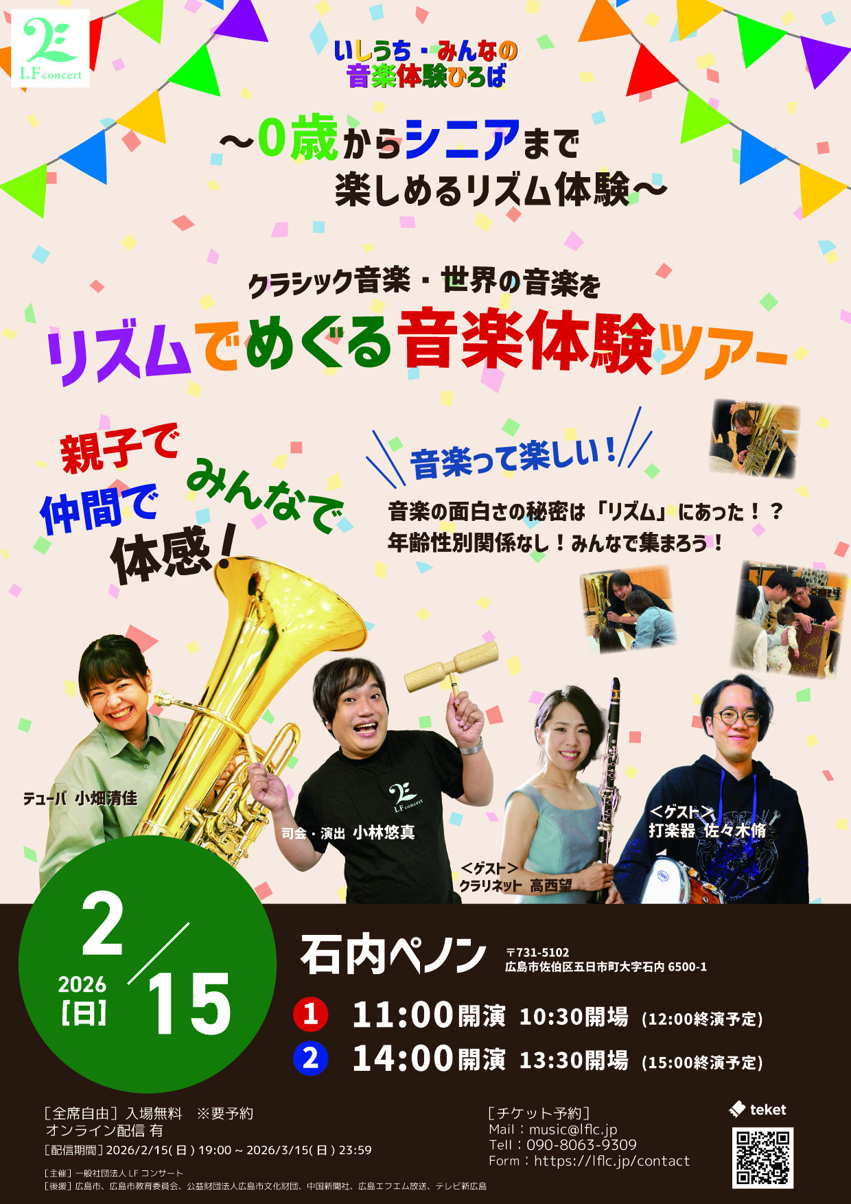 LFコンサートが贈る「いしうち・みんなの音楽体験ひろば」は、童謡やジブリの名曲など身近な楽曲を題材に、リズムの変化を五感で味わう体験型プログラムです。2拍子から4拍子までの不思議な違いを聴き比べるセッション、世界各地のリズムを巡るリズム小旅行、最後は参加者全員で手拍子や体の動きで演奏に挑戦。0歳からシニアまで楽しめるインタラクティブなひとときをお届けします。