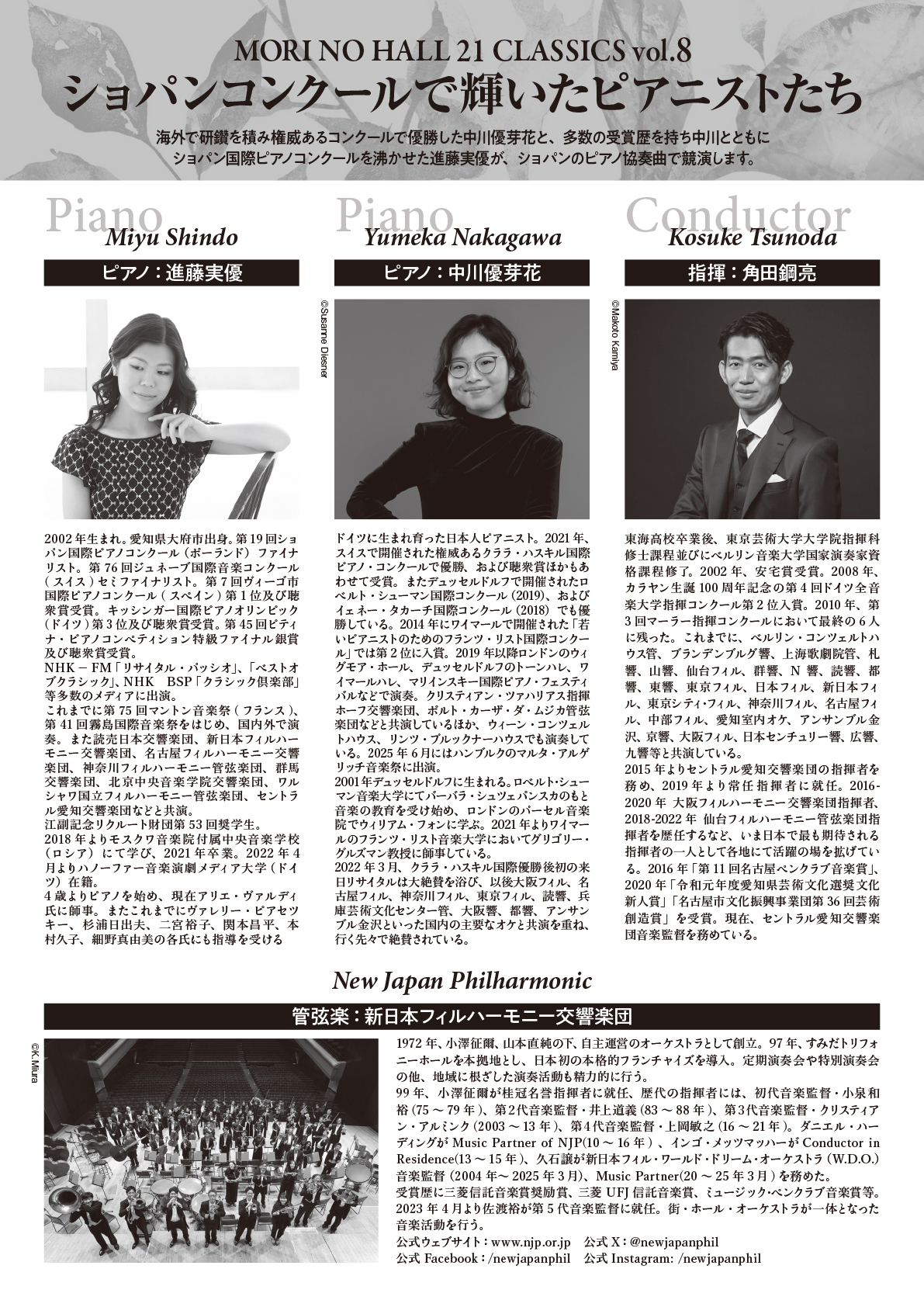 海外で研鑽を積み権威あるコンクールで優勝した中川優芽花と、多数の受賞歴を持ち中川とともにショパン国際ピアノコンクールを沸かせた進藤実優の二人が、ショパンのピアノ協奏曲で競演します。