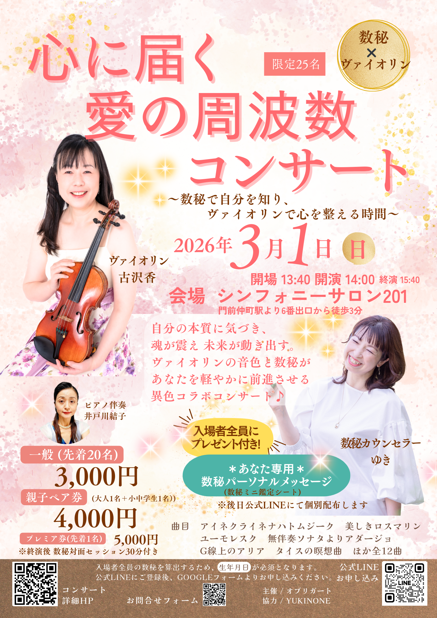 『数秘✖ヴァイオリン 心に届く愛の周波数コンサート』は、数秘術のメッセージとヴァイオリンの響きを掛け合わせ、参加者一人ひとりの内面に寄り添う体感型イベントです。数秘カウンセラーゆきさんによる個別メッセージとともに、古沢香氏の繊細なヴァイオリン、井戸川結子氏の豊かなピアノがアイネクライネナハトムジークやタイスの瞑想曲など名曲を彩ります。数字に対応する音の周波数が心を整え、癒しと気づきをもたらすひとときをお届けします。