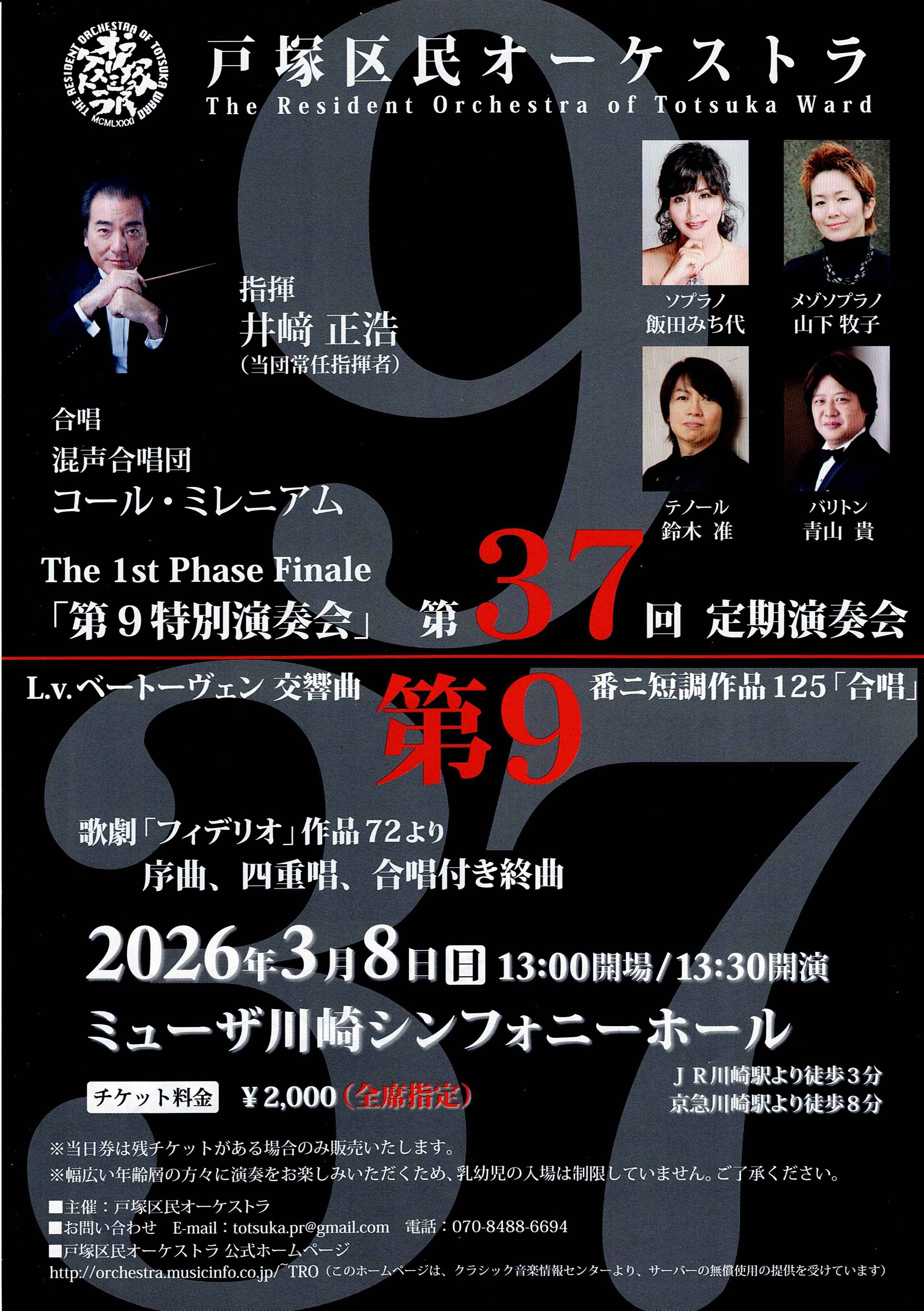 戸塚区民オーケストラによる第37回定期演奏会では、創立以降培われた確かな演奏技術を背景に、ベートーヴェンの歌劇「フィデリオ」序曲・四重唱・終曲と、交響曲第九番「合唱」という壮大な二大名曲をお届けします。井崎正浩の指揮のもと、飯田みち代、山下牧子、鈴木准、青山貴の4大ソリストと混声合唱団コールミレニアムが結集し、圧倒的な合唱とオーケストラのハーモニーが会場を包み込みます。ミューザ川崎シンフォニーホールで繰り広げられる、感動と歓喜に満ちた演奏をご堪能ください。