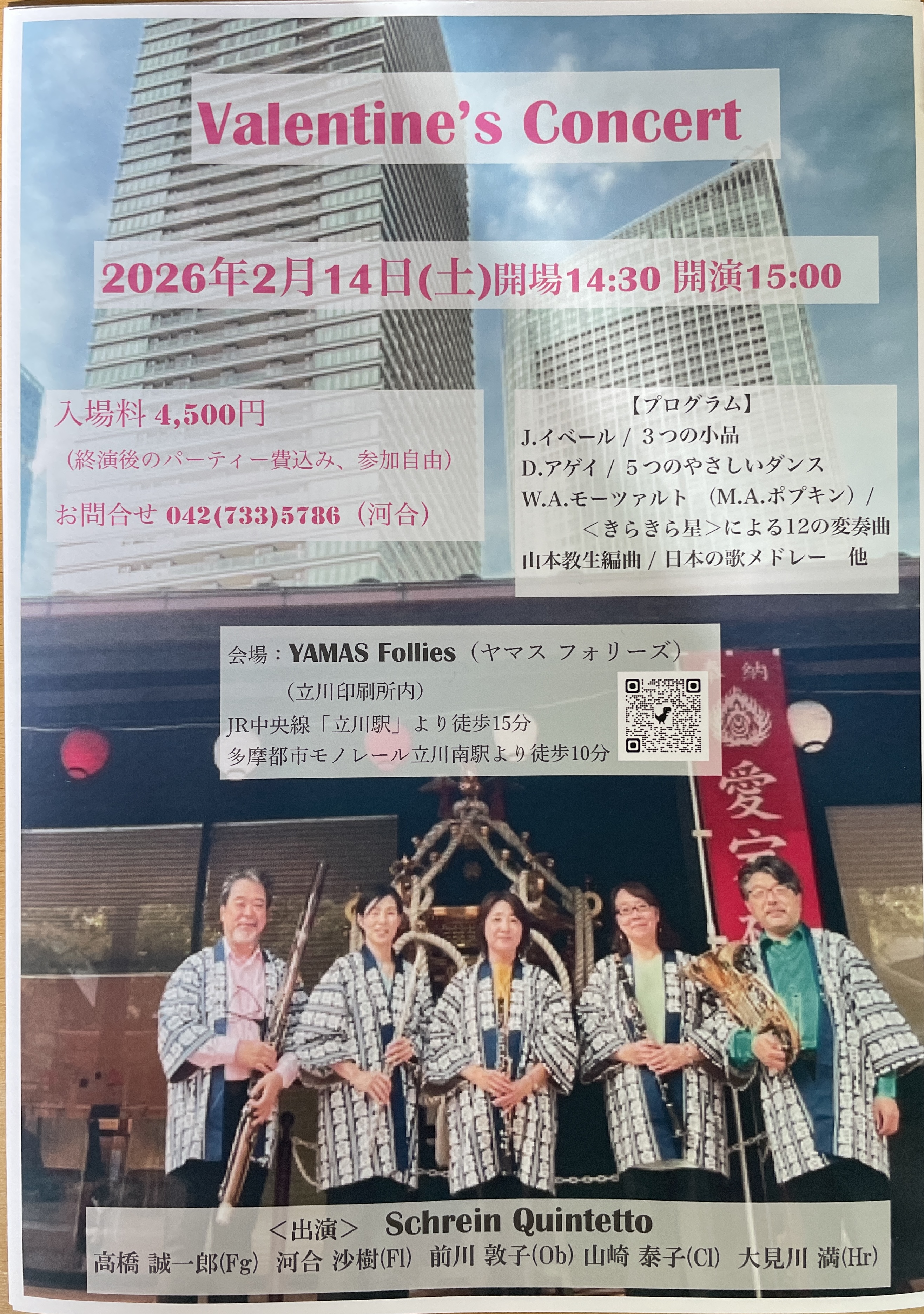 イベール やアゲイなどの木管五重奏のオリジナル作品から、「きらきら星による12の変奏曲」や日本の歌メドレーなど、皆様にもお耳馴染みのある作品まで、様々なジャンルの作品を組み合わせたプログラムで、木管五重奏の魅力をたっぷりとお届けしたいと思っております。どうぞお気軽にいらして下さい。
