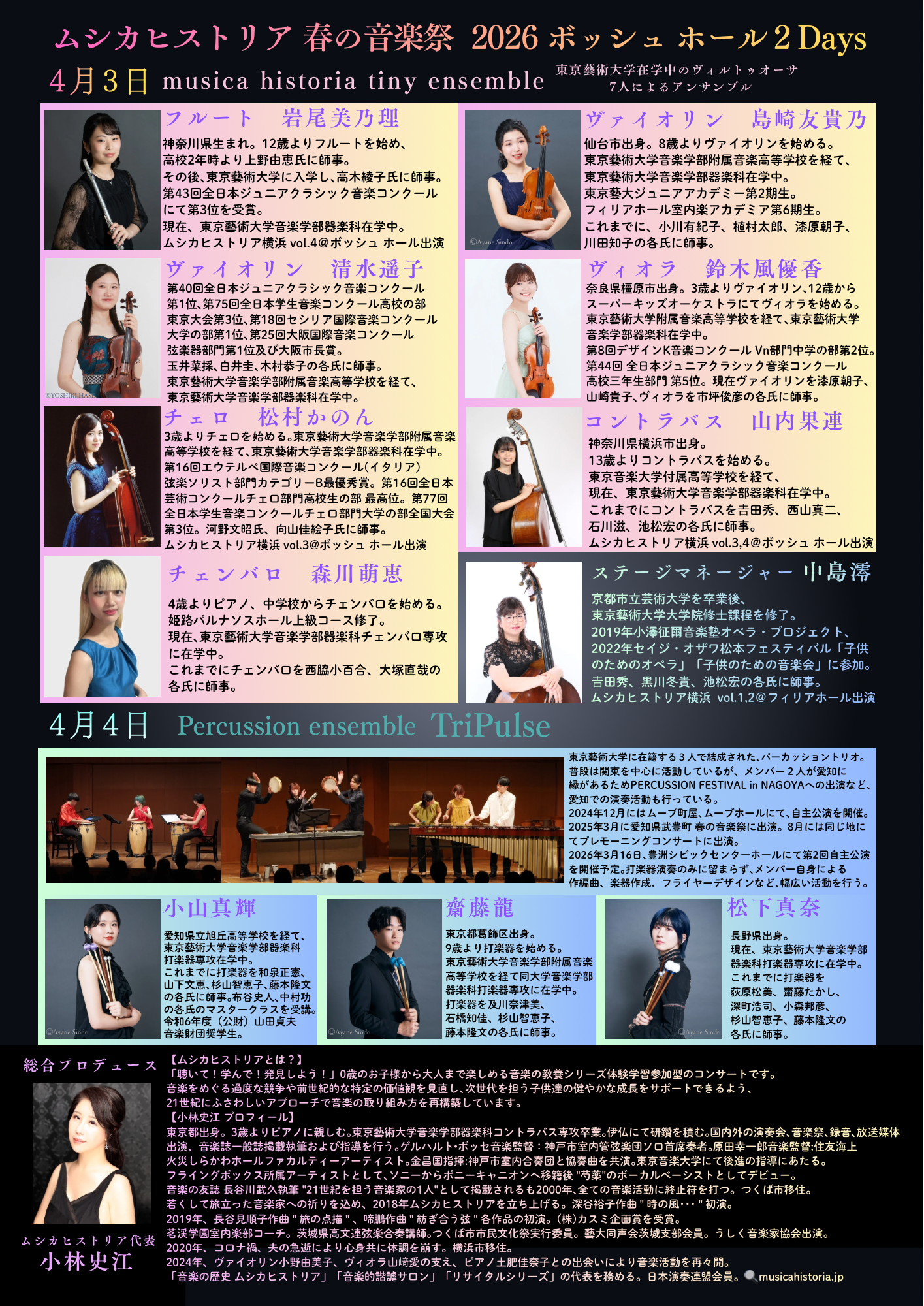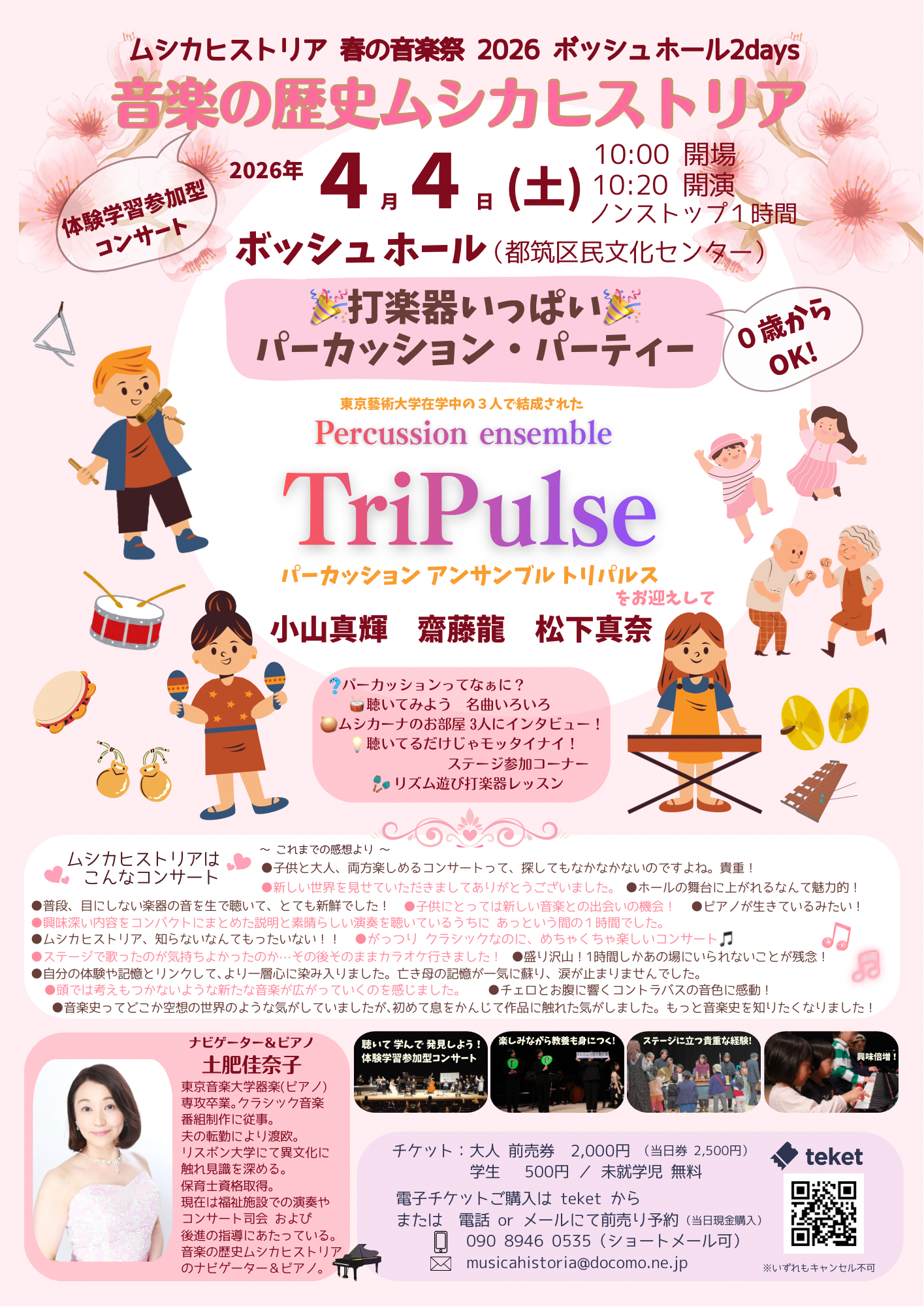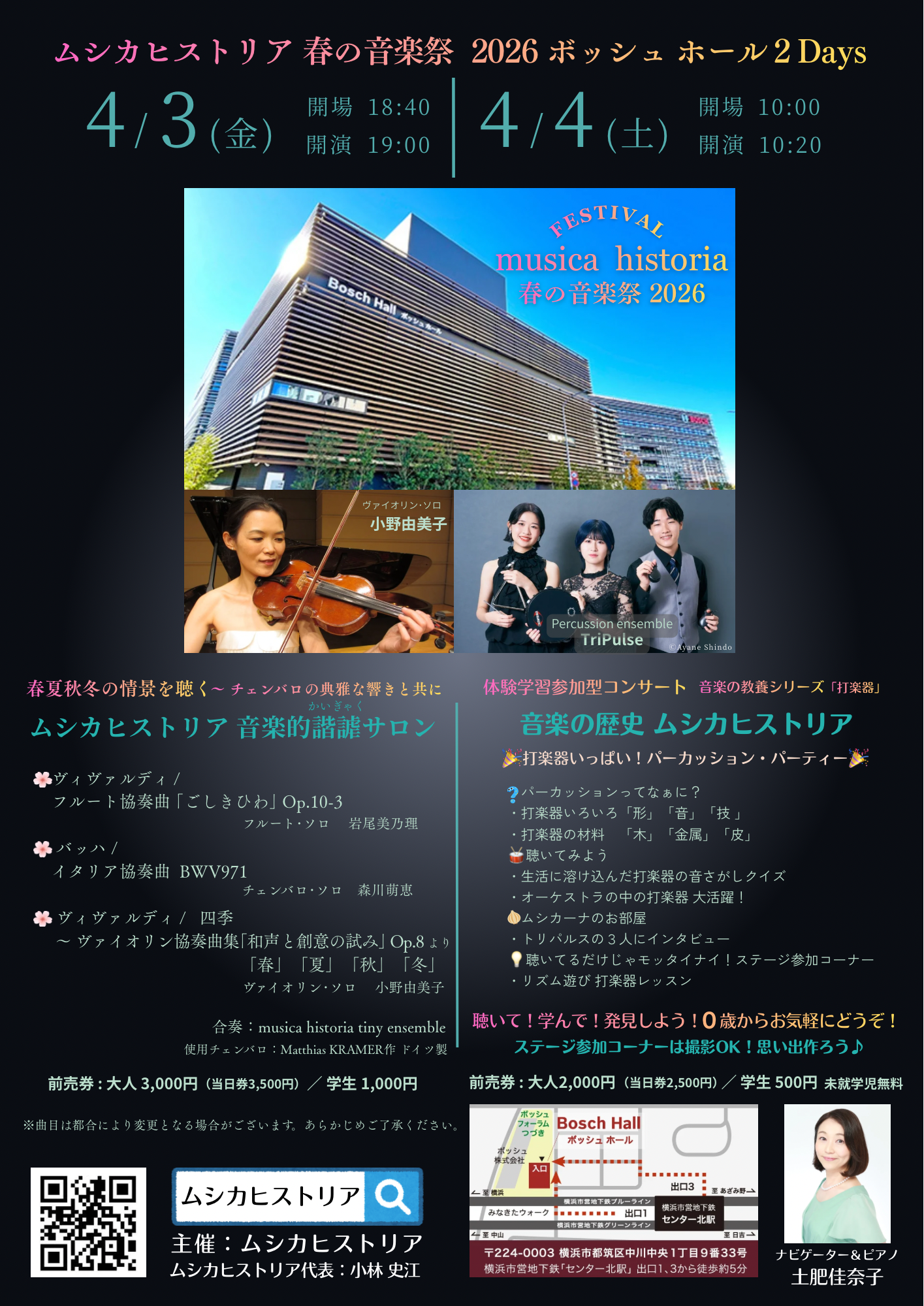 横浜の都筑区民文化センター(ボッシュホール)にて開催される「ムシカヒストリア春の音楽祭2026」の2日目は、打楽器をテーマにした体験参加型コンサートをお届けします。